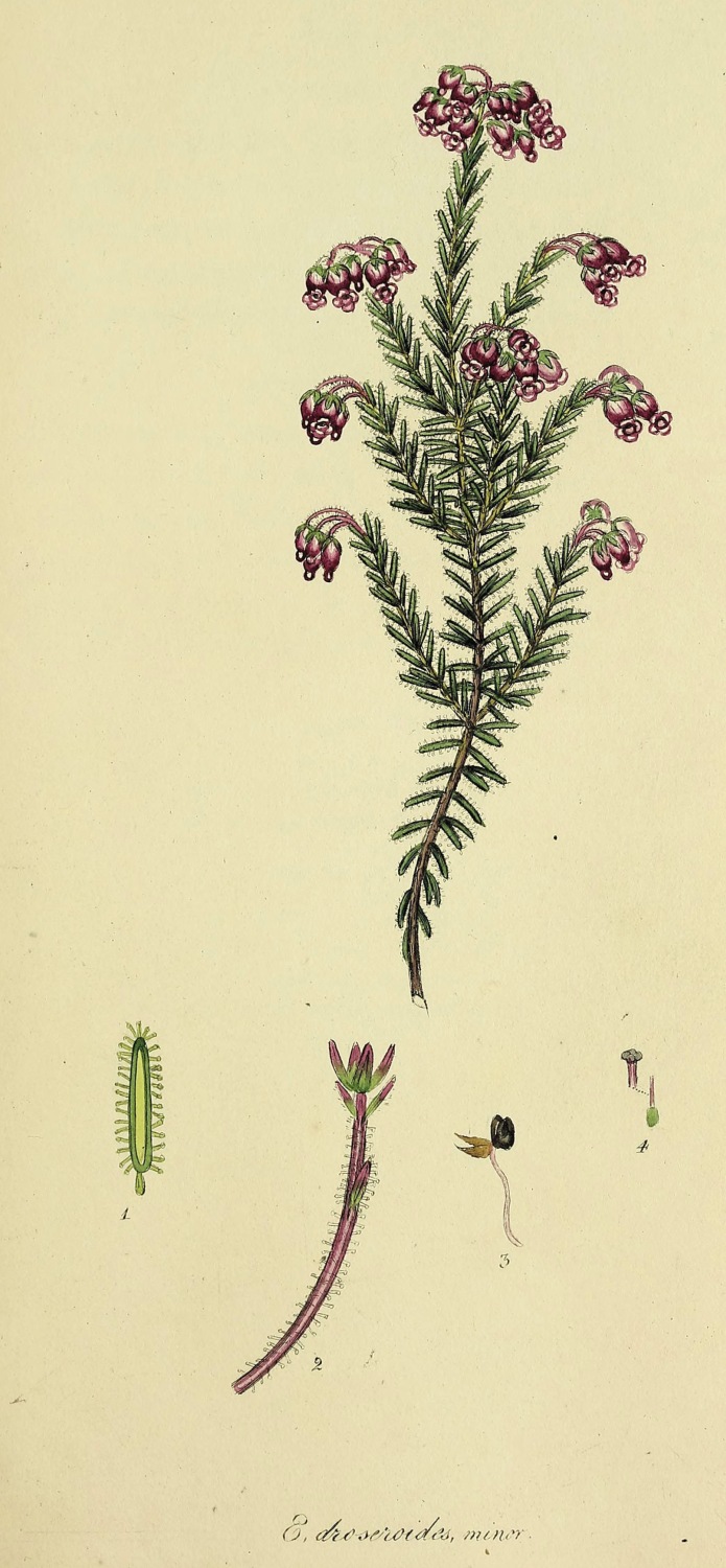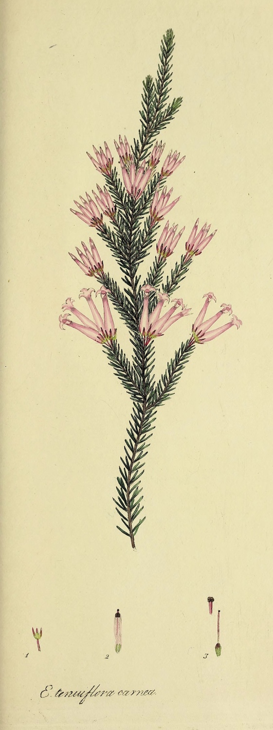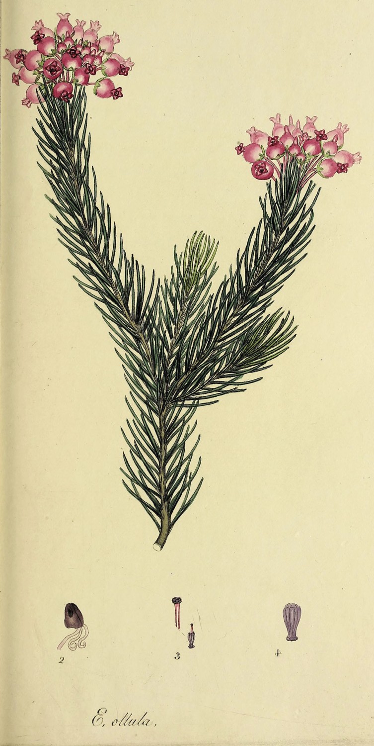 Tips beardless, within the blossom. Flowers terminate the branches by threes and fours, mostly ascending. Blossom trumpet-shaped, very slender, and flesh-coloured: segments of the border are equal, heart-shaped, pointed, and spreading. Leaves mostly by fours, slightly downy, linear, short and pointed, flat on the upper surface, and furrowed beneath. Stem a foot or more high, shrubby, flexuose, thread-shaped, and twiggy.
