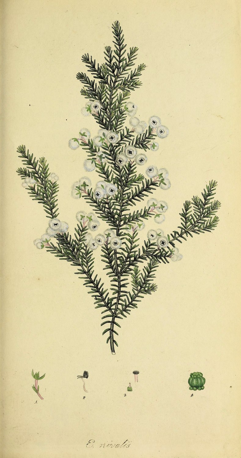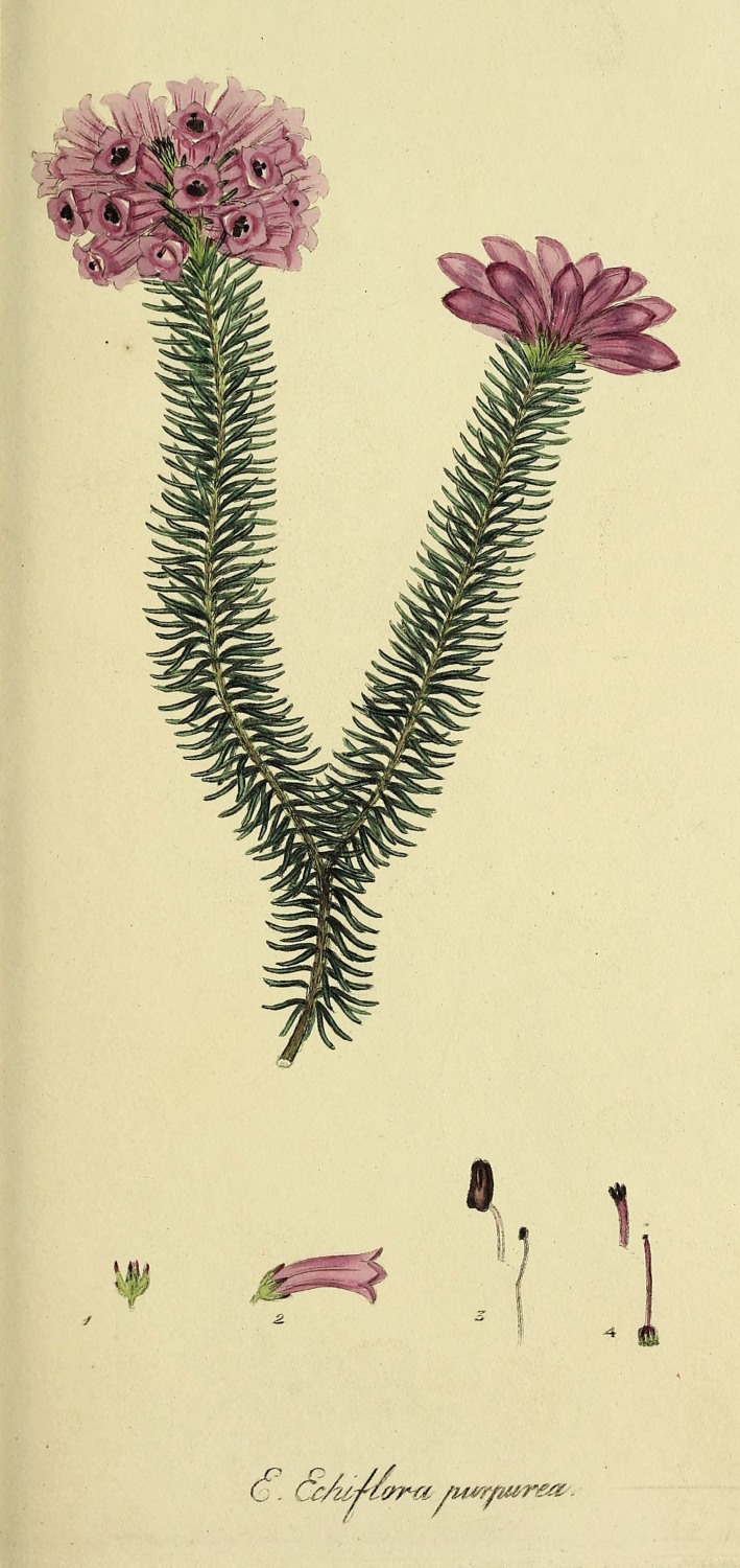 Tips beardless, within the blossom. Flowers grow near the summit of the branches in whorls, spreading out. Blossom purple, cylindrical, an inch long, and rather narrowed at the mouth: segments of the border heart-shaped, sharp pointed, and rolled back. Leaves by fours, three-sided, revolute, sharp-pointed, and shining, flat on the upper surface, and furrowed beneath. Stem shrubby, a foot high, branching. Branches flexuose, and thread-shaped.