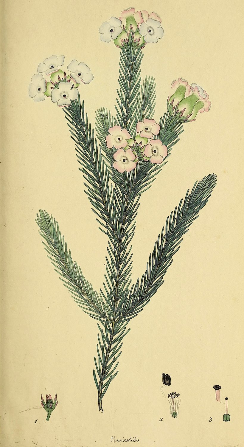 Tips beardless, within the blossom. Flowers terminal, densely whorled, and horizontal. Blossom tubular, short, inflated, and ribbed, resembling an Echium: segments of the border spreading and heartshaped. Leaves grow in irregular whorls of fives or sixes, linear, and pointed. Stem shrubby, a foot and half high.