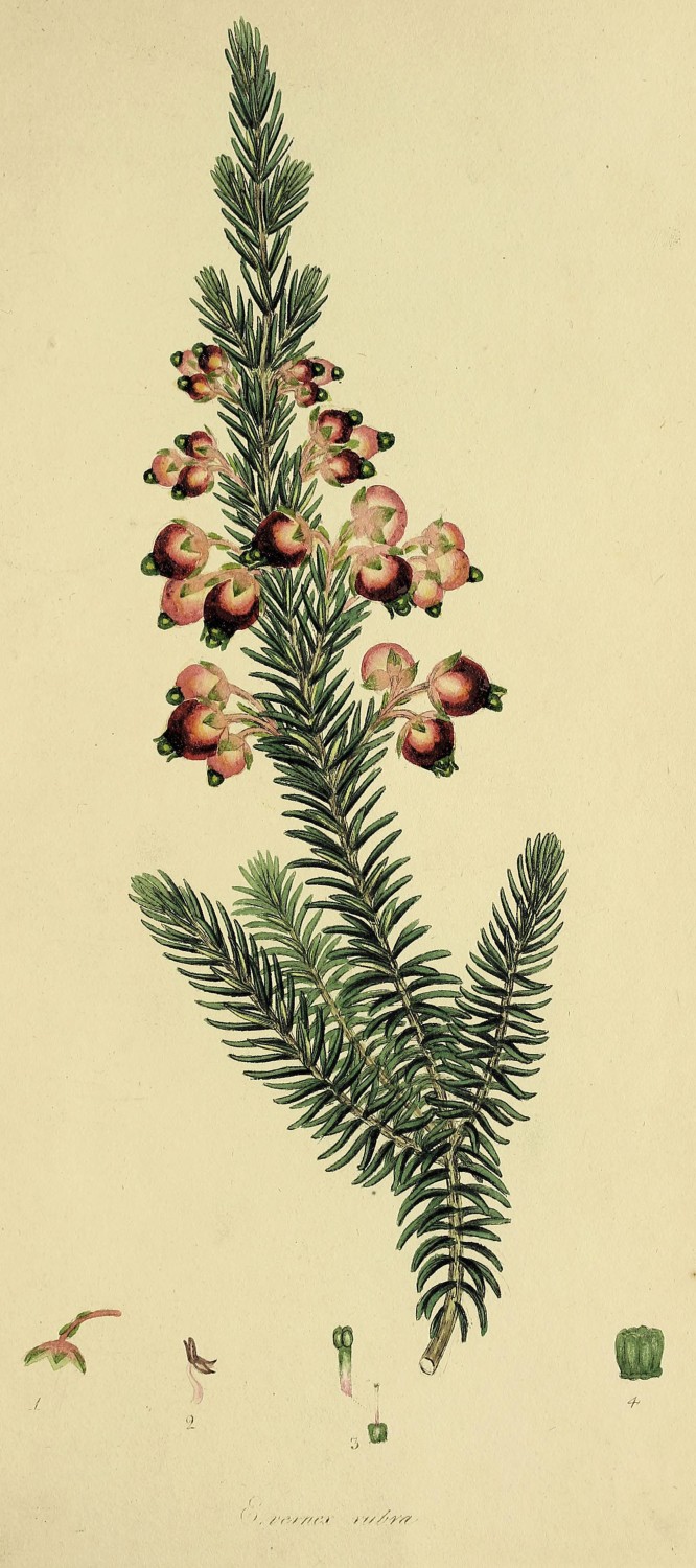 Tips crested, within the blossom. Flowers terminate the branches in umbels. Cup four-leaved; leaflets spatula-shaped, sharp-pointed, and flesh-coloured. Blossom pitcher-shaped, of a black red colour, whitish at the base; segments of the border spreading and pointed. Leaves by threes, lance-shaped, three-sided, pointed, and pressed to the branches. Stem twiggy, a foot high. Branches flexuose.