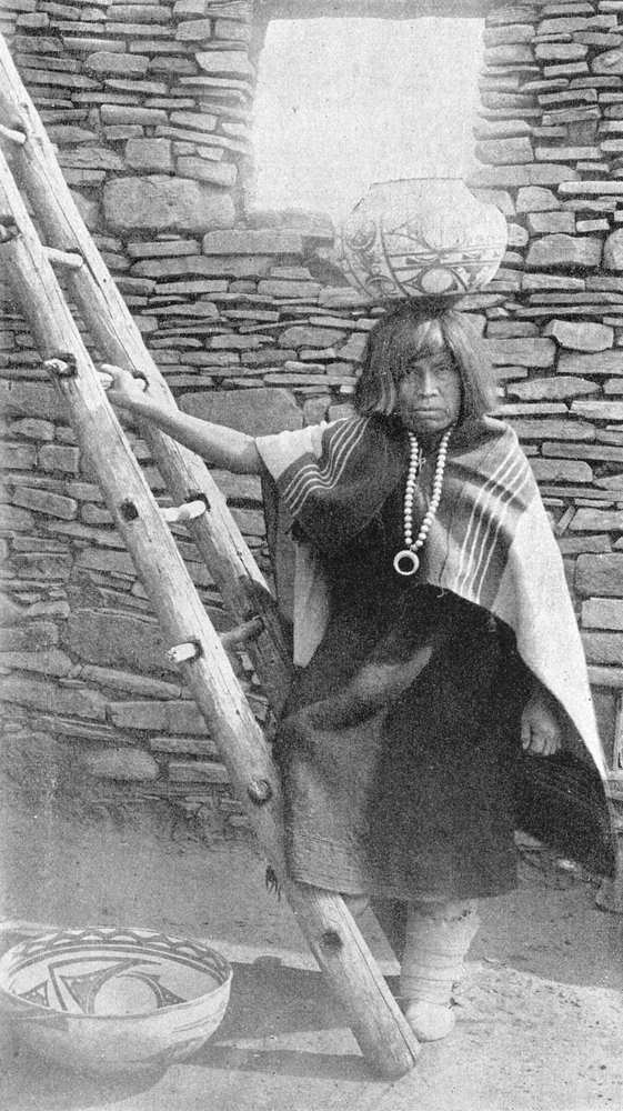 The nature of the civilization that has produced this woman is quite different from that of which the Navajo, Anserino, was the outcome. Pueblo Indians in their civilization possess much in common; they are sedentary types, and their history extends far, far back into time. They occupy in Arizona and New Mexico, in our day, not far isolated groups, of what may be called agglomerations of rubble sandstone houses laid in mud and piled one upon another, with narrow streets among them. These remnants of a departing nation are in some instances found huddled together upon some plain, near a river’s bank, as in the case of Zuni and others; or they may cap some rocky crag, a young rugged mountain, with sides precipitous, as in the case of Wolapi. Much in the crude [Pg 12]philosophy, the mythology, and opinions of these people is wise and beautiful; and much there is, too, that is low and debasing and richly tinctured with the more degraded myths of savagery. These several Pueblan groups have their governments most peculiar, and they, too, as a people have produced their agriculturists, their warriors, their workers in silver and iron, their manufacturers of clay pottery, and weavers of blankets; and those that have followed the simpler industrial arts.