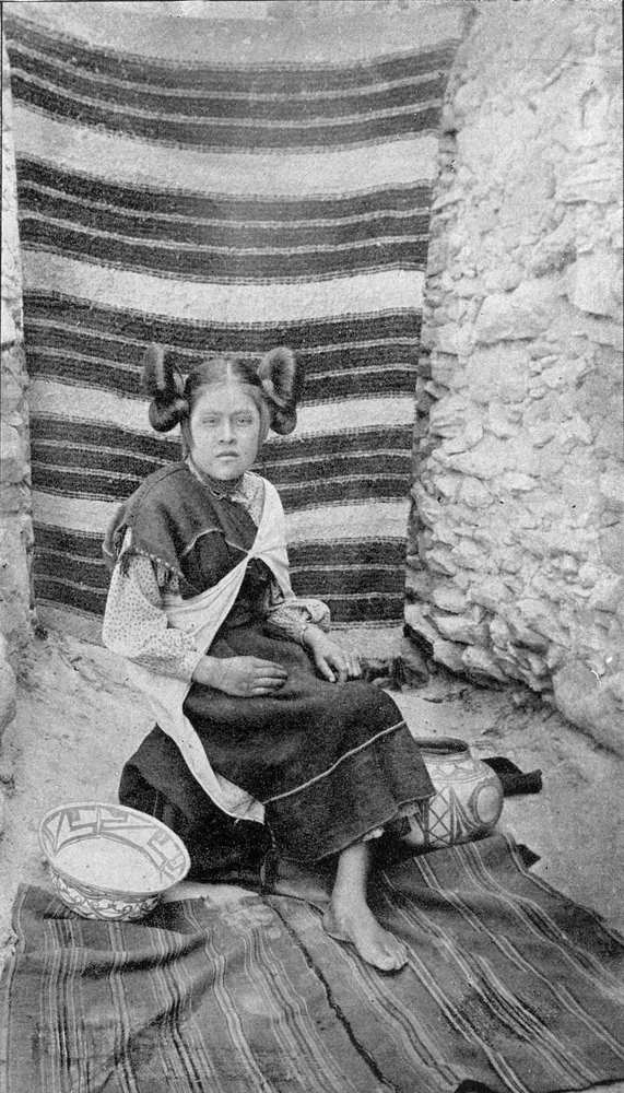 Prior to marriage, one of these girls, as may be seen, does up her hair in the most extraordinary manner; it is parted in the middle, combed out at the sides, and then done up over slender twigs carefully wrapped with woolen yarn, into two great whorls, one standing out upon either side of the head immediately above the ears. In front of this a lock hangs down over the temple and side of the face. This latter is a true oval, and its various features combine to make it bright and intelligent. The brows are arched, the nose well shapen, the cheekbones by no means prominent; and, indeed, upon the whole the face may be said to be quite a pretty one. They do not wear near as much jewelry as do the Navajos, while in most respects their costume agrees with the Zuni girls; but our Moqui maiden is more prone to go about barefooted, and often neglects to wear the leggins of buckskin, so characteristic of both Navajos and Zunians alike. These Moqui girls marry young, often at ten years of age, and they are monogamists. Bourke, in his wonderfully interesting work upon these people, says: “Boys and girls of advanced age roam unconcernedly through the streets of the different towns, especially of those farthest to the west, in a condition repugnant to our notions of modesty and delicacy. The traveler among the Moquis learns as much of the customs of the Garden of Eden, in respect to dress, as he is ever likely to in any other part of the world.”