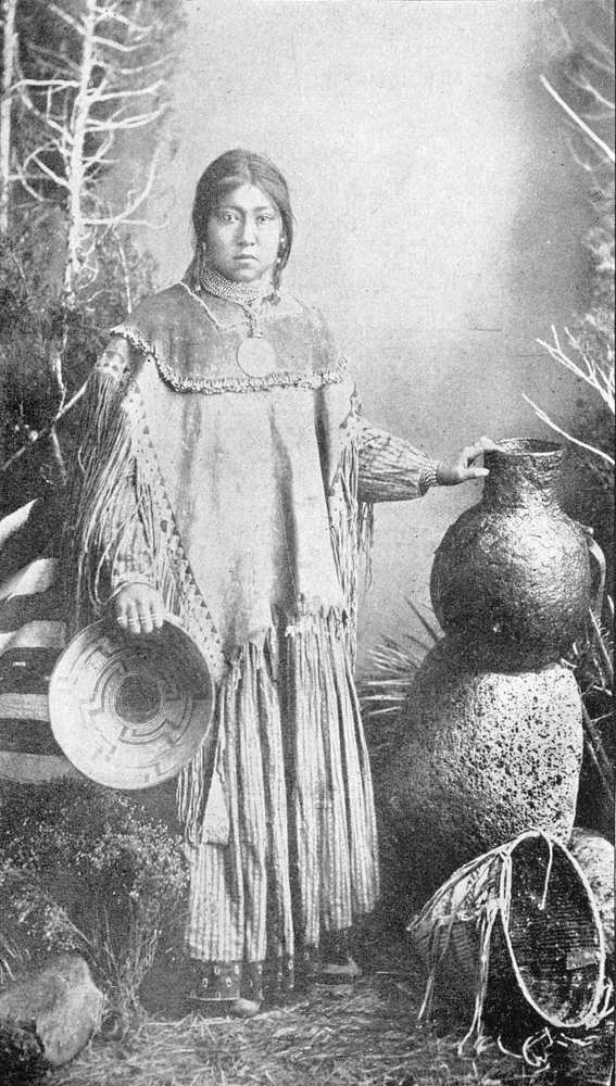 It will be observed from the accompanying picture I am enabled to present of her, that she is of but medium height, of a good figure, and well developed. As among most Indian women her hands and wrists are very large, and this also applies to her feet, which cannot be seen in the illustration. She shows no tattoo-marks or mutilations anywhere upon her face or body, though in this statement must not be included the fact of the removal of all hair except that which grows so abundantly upon the head and the brows. This latter is black, rather long, and frequently dressed. It is worn parted for a short distance in the middle in front; drawn off the face, and braided up and tied behind. She wears no ornaments in her hair beyond the wrappings of her braid. Her skin is smooth and [Pg 8]of a tawny chocolate color, and her head well-poised upon her rounded shoulders.