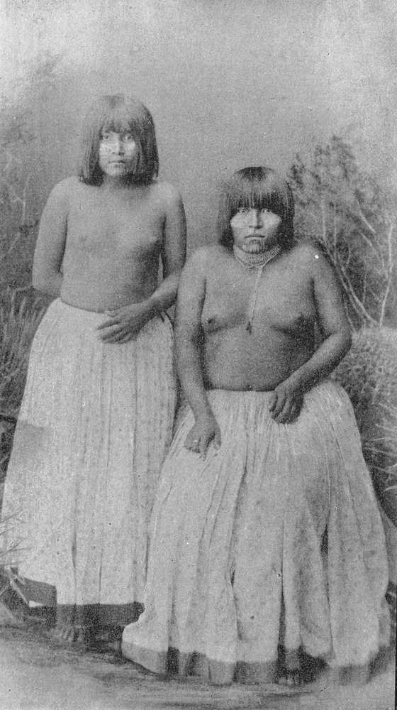 The men among the Mojaves, too, are generally splendid [Pg 20]examples of muscular development, and have finely proportioned figures, whereas it is the exception to find, in this interesting tribe, any women that we would even consider to be at all good-looking. My figure presents two Mojave women; the one sitting down is Sowatcha, and the other standing at her side is Luli-pah. They are both married, as is indicated by the vertical tattoo lines upon their chins, and a glance is sufficient to satisfy us that they are very different appearing from any of the Indian women we have thus far examined. Sowatcha typifies her sex as we find them among this tribe. Her costume consists solely of a half dozen coils of beads worn as a necklace about her neck, and a calico skirt made fast at the waist by a string, and falling as far as the feet. Luli-pah, her companion, even lacks the necklace, otherwise her dress is the same (Fig. 7).