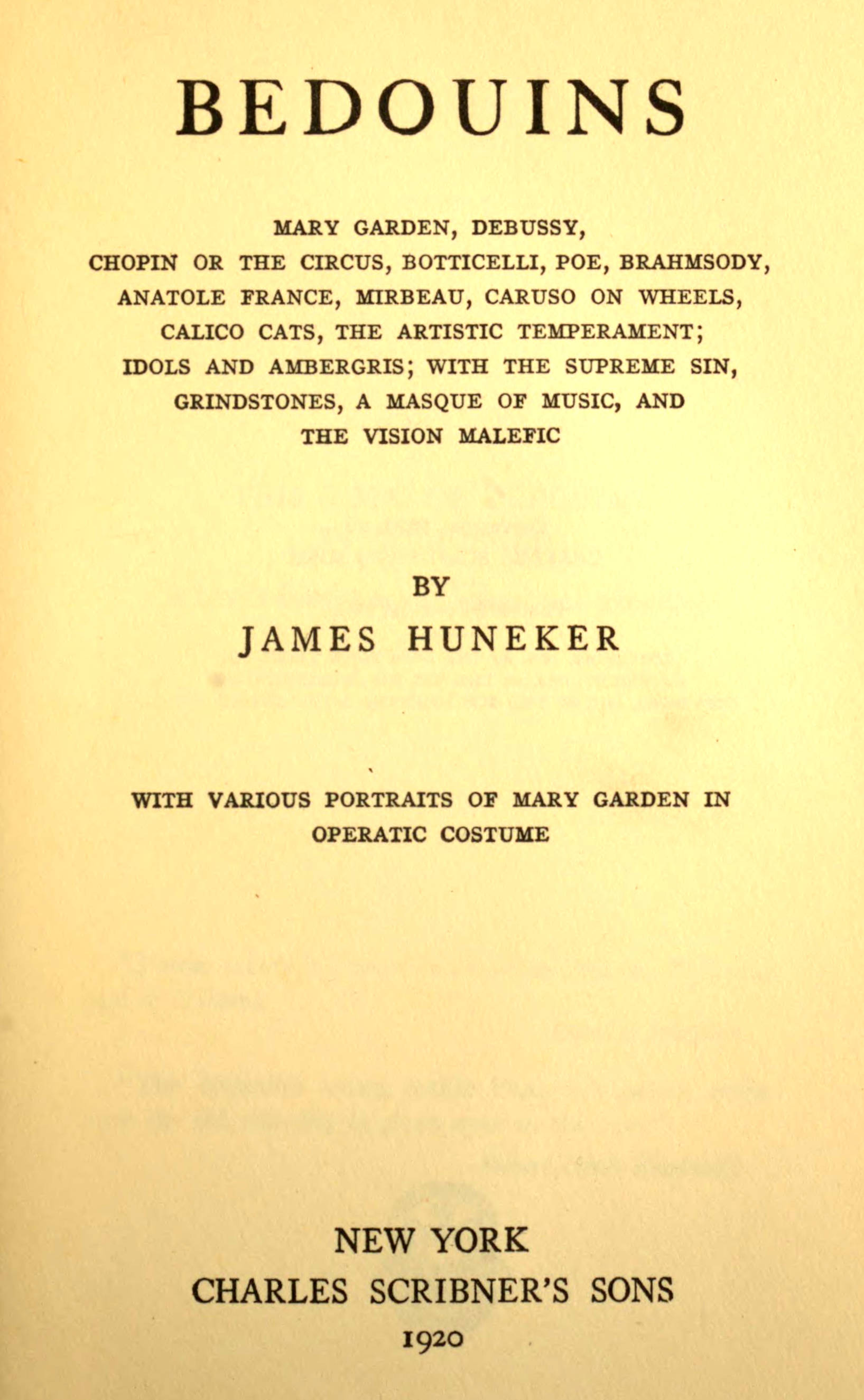 “Mr. James Huneker, critic of music in the first place, is a craftsman of diverse accomplishment who occupies a distinctive and distinguished place among present-day American essayists. He is intensely ‘modern,’ well read in recent European writers, and not lacking sympathy with the more rebellious spirits. Ancient serenity has laid no chastening hand on his thought and style, but he has achieved at times a fineness of expression that lifts his work above that of the many eager and artistic souls who strive to be the thinkers of New England to-day. He flings off his impressions at fervent heat; he is not ashamed to be enthusiastic; and he cannot escape that large sentimentality which, to less disciplined transatlantic writers, is known nakedly as ‘heart interest.’ Out of his chaos of reading and observation he has, however, evolved a criticism of life that makes for intellectual cultivation, although it is of a Bohemian rather than an academic kind. Given a different environment, another training, Mr. Huneker might have emerged as an American Walter Pater.”—London Athenæum (November 6, 1915).