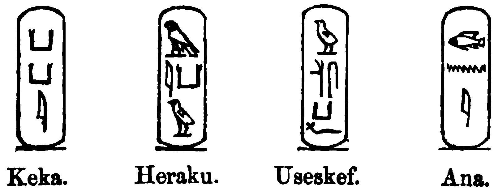 [103] [In Bunsen’s list of Determinatives, No. 5. I quote his description “Disk diffusing rays of light; light, as sti, a sunbeam, (sun’s ray); ht, daylight; ubn, to illuminate; mau, to gleam; ui, brilliancy; hai, light; am, a beam.” Bunsen’s Egypt’s Place, vol. i. p. 537.—Since writing the foregoing note in the first edition, I have read the Rev. Charles Forster’s Monuments of Egypt, and I find that he attempts to identify this royal sign with a grain of millet, “with its stamina and antheræ developed,” assigning for its pronunciation the word “pschent.” I forbear criticism upon this “discovery,” only referring the reader to p. 54 of the second part of the Primæval Language.—K. R. H. M.]