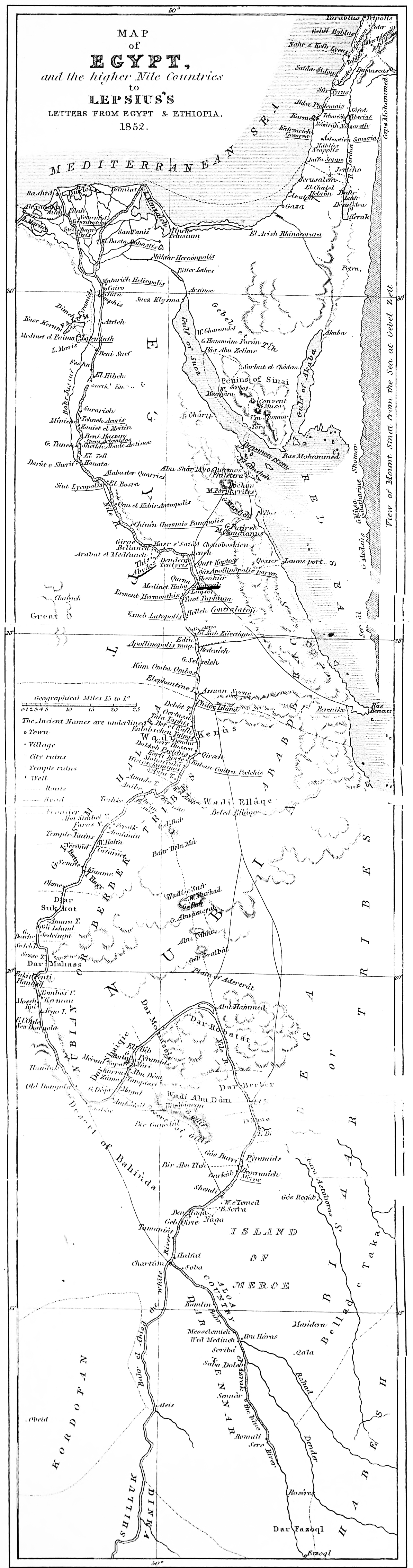 [107] This report, sent to His Majesty, was printed, while I was still absent in 1846, under the title “Reise des Prof. Lepsius von Theben nach der Halbinsel des Sinai vom 4ten März, bis zum 14ten April, 1845,” Berlin, with two maps, a general map of the whole peninsula, and a special map of Serbâl and Wadi Firân, which were drawn by G. Erbkam after my directions or plans. This pamphlet was not published, but was given to a few; yet its contents have become better known by a translation into English by Charles H. Cottrell, (A Tour from Thebes to the peninsula of Sinai, &c., London, 1846); and into French by T. Pergameni, (“Voyage dans le Presq’île du Sinai, &c., lu à la Société de Géographie, séances du 21 Avril et du 21 Mai. Extrait du Bulletin de la Soc. de Géogr., Juin, 1847, Paris.”)