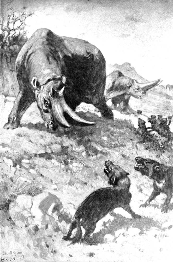 Arsinothere of three million years ago impaling a carnivorous creodont, somewhat resembling a hyena.