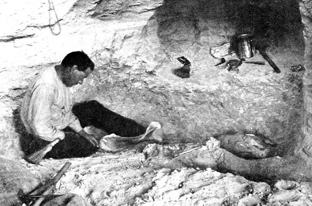 As the dawn broke, three riders, at full speed, guided by the light of the fire, came dashing down the ravine, and the first rays of the rising sun[Pg 348] showed them the boy asleep, pillowed on the outcrop of a Brachiosaurus, which later quarrying was to prove one of the finest of its kind.