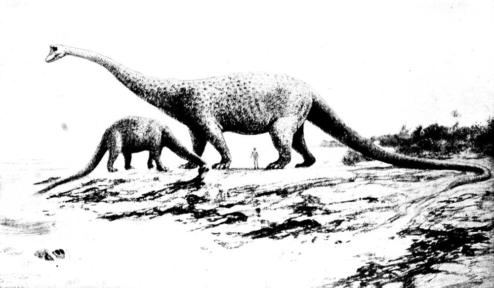 Restoration of Gigantosaurus, from East Africa, closely related to the American genus Brachiosaurus (restoration based on incomplete knowledge and is much exaggerated, since, though bulkier, it probably was not longer than the Diplodocus, correct scientific restoration awaits setting-up of skeleton now in Berlin): a Diplodocus, which previously held the record for size, shown to the left; also, for comparison, the figure of a man is drawn in, though, of course, Gigantosaurus lived at least eight million years before the first man. From Gregory, in “Geology of To-day.”