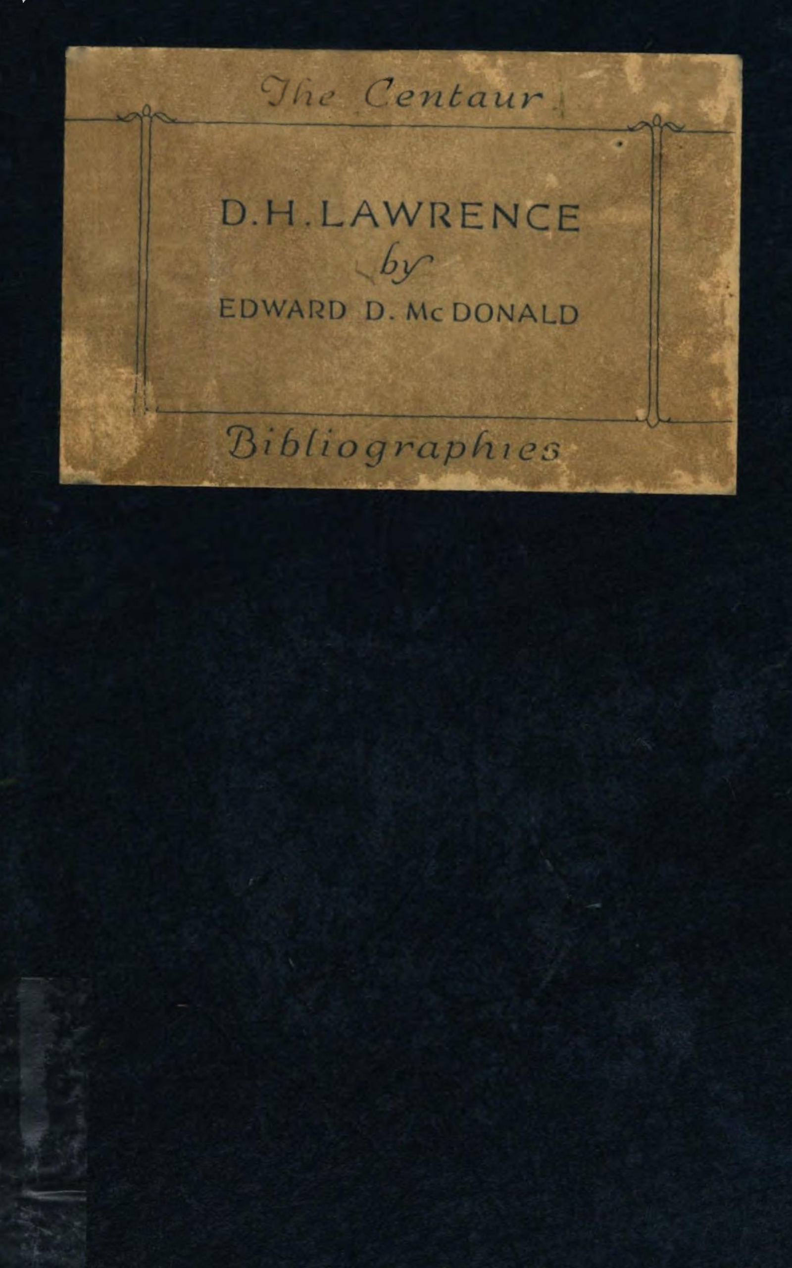 This book, a record of the published writings of Mr. D. H. Lawrence, follows the general plan of the Centaur Bibliographies which have preceded it. The opening section contains collations of the first issues of Mr. Lawrence’s books, twenty-seven in all. Among these collations is that of Movements in European History, a book written by Mr. Lawrence, published under the nom de plume Lawrence H. Davison, and never heretofore openly attributed to him. Many of the collations are accompanied by notes. Some of these discuss bibliographical points which could not be adequately covered in the more technical descriptions of the books; others estimate the relative scarcity of the various items, or give information about interesting editions after the first; a few are critical.