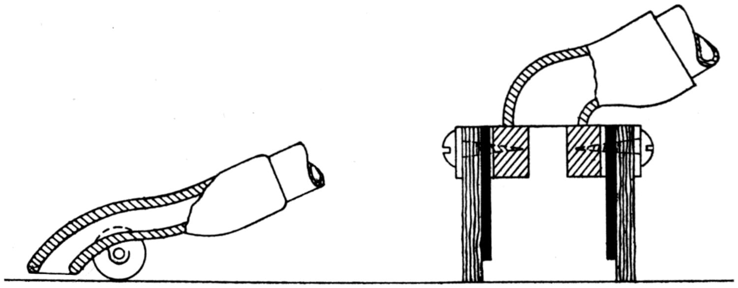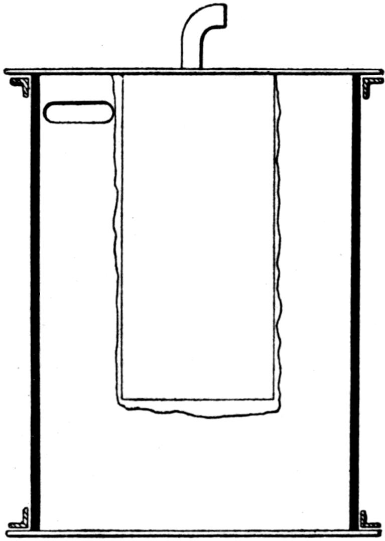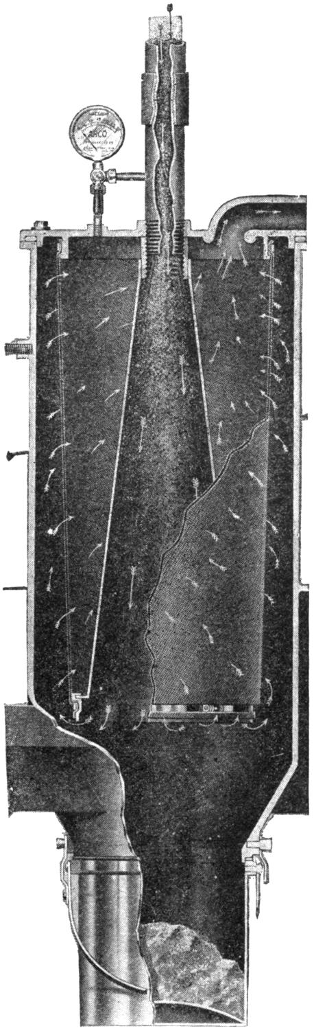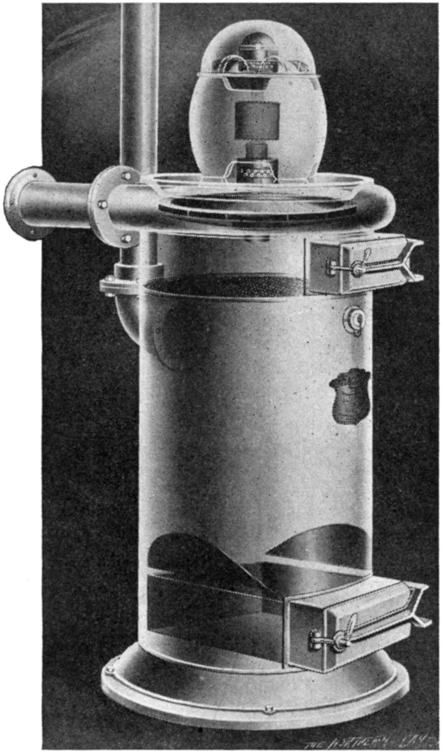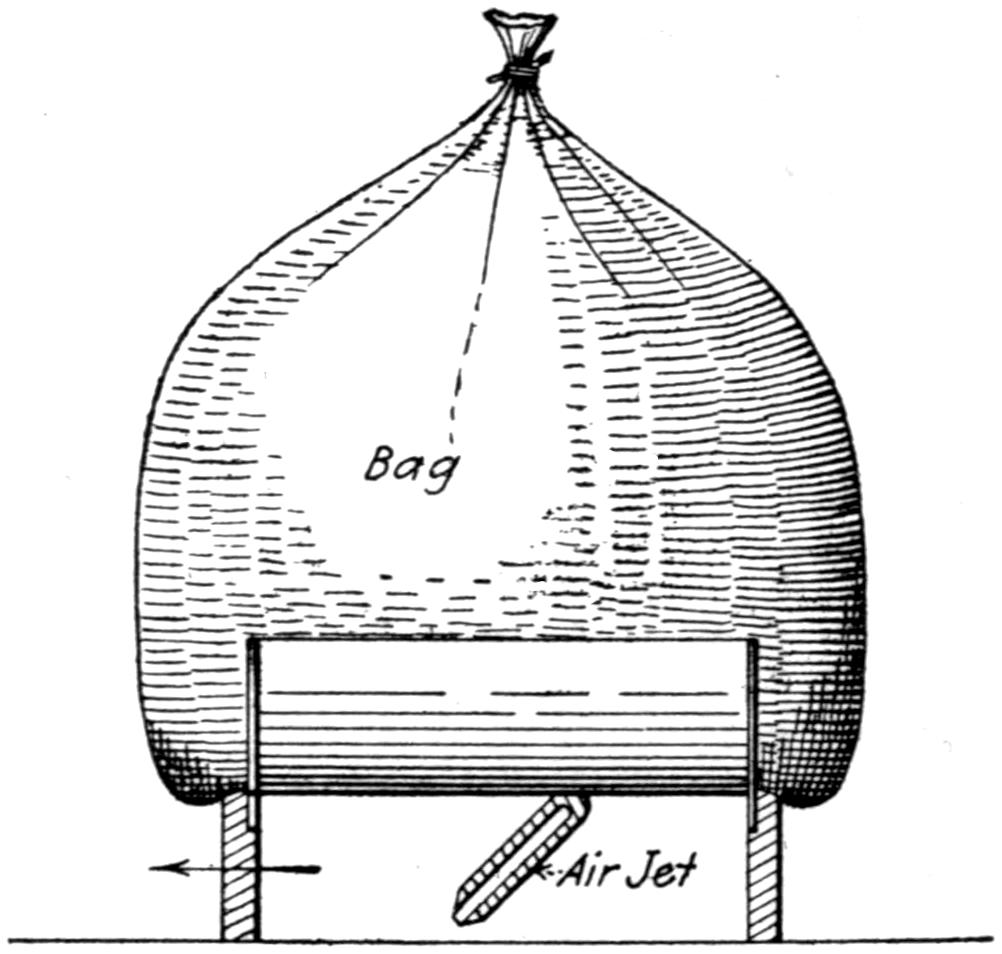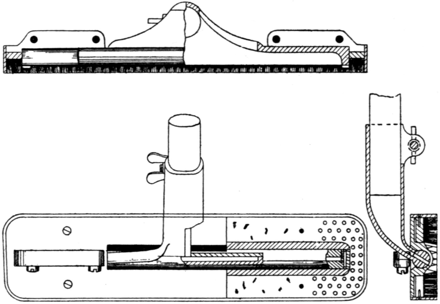 Machines of this type are open to another objection in that the dust bag is placed on the outlet of the fan and the dust in the bag is continually agitated by the passage of the air, with the result that all the finer particles of the dust are blown through the bag back into the apartment. To be effective, the dust bag must always be placed on the suction side of the exhauster and should be so arranged that the dust will not quickly[231] cover the entire area of the bag, for, when this occurs, the suction is quickly reduced to such an extent that no further cleaning can be done until the bag has been cleaned.