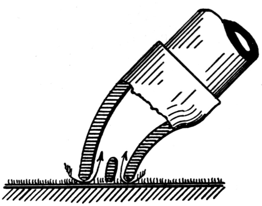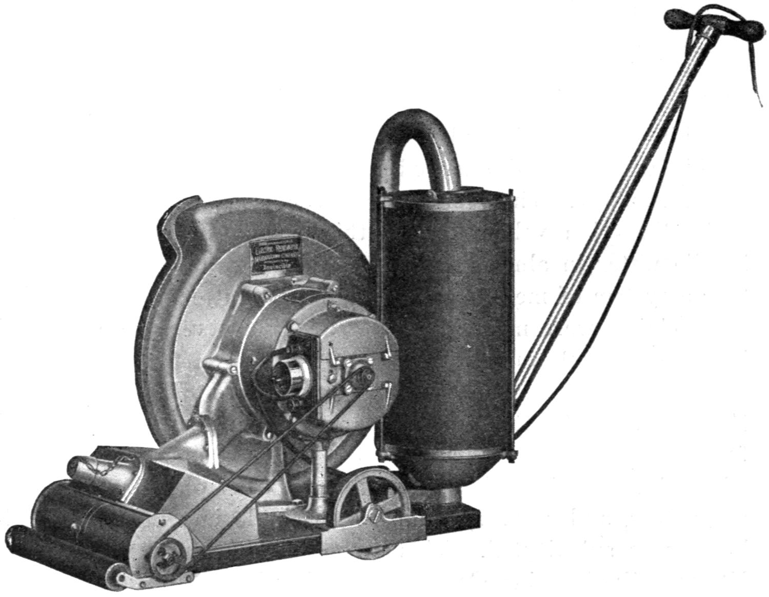 There is another type of mechanical cleaner manufactured by the Hoover Suction Sweeper Company which is provided with a mechanically-operated brush for loosening the dirt from the carpet. The dust is then conveyed through a single-stage fan to a dust bag. The cleaner does not depend on the vacuum to loosen the dirt and will do quite effective carpet cleaning with a small expenditure of power. Owing to the small suction produced, it is of little value for cleaning anything but carpets.
