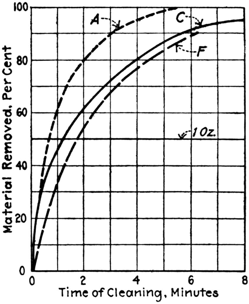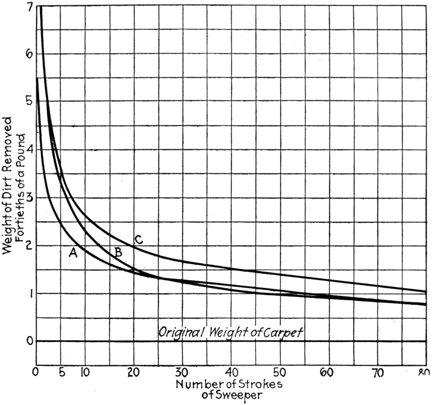 A good test for capacity of a portable machine is to pick up ¹⁄₂ peck of such material, then fit a thin disk with ⁷⁄₈-in. diameter opening over the end of the hose. A machine, to be of any value, should show a suction of 3 in. water and a first-class machine will show 8 in. under these conditions. This will do fairly good bare floor work. To ascertain if the machine will clean carpets, use a similar disk with ⁵⁄₈-in. diameter opening, when a suction of 7 in. water indicates the lowest value and 16 in. about the best that can be obtained from any portable cleaner. Cleaners must be readily portable and should not weigh exceeding 75 lbs.
