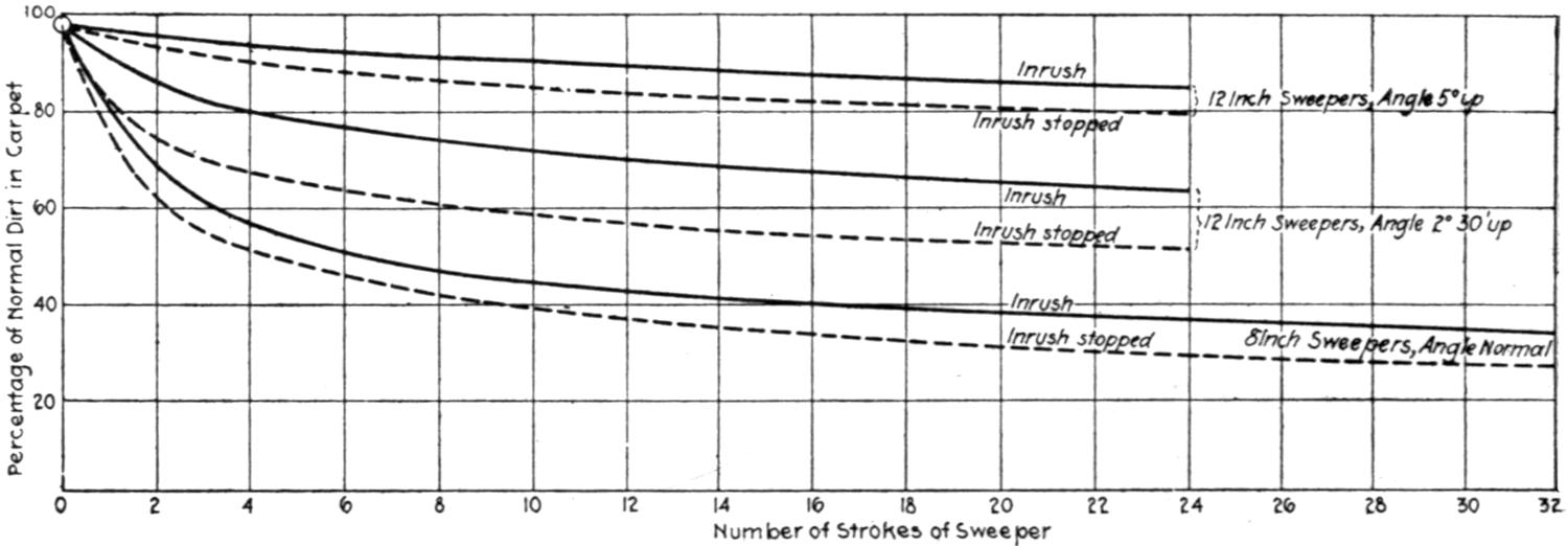 The smaller-fan type of machines, in which the fan is placed integral with the carpet renovator and in which hose is not used in cleaning floors or carpets, are provided with a single-stage fan. They produce a suction of not exceeding ¹⁄₂ in. of mercury when no air is exhausted and will exhaust from 5 to 10 cu. ft. of free air per minute when operated on a carpet. With a free inlet they will exhaust from 15 to 20 cu. ft. of free air per minute. These machines are little if any better than ordinary carpet sweepers.