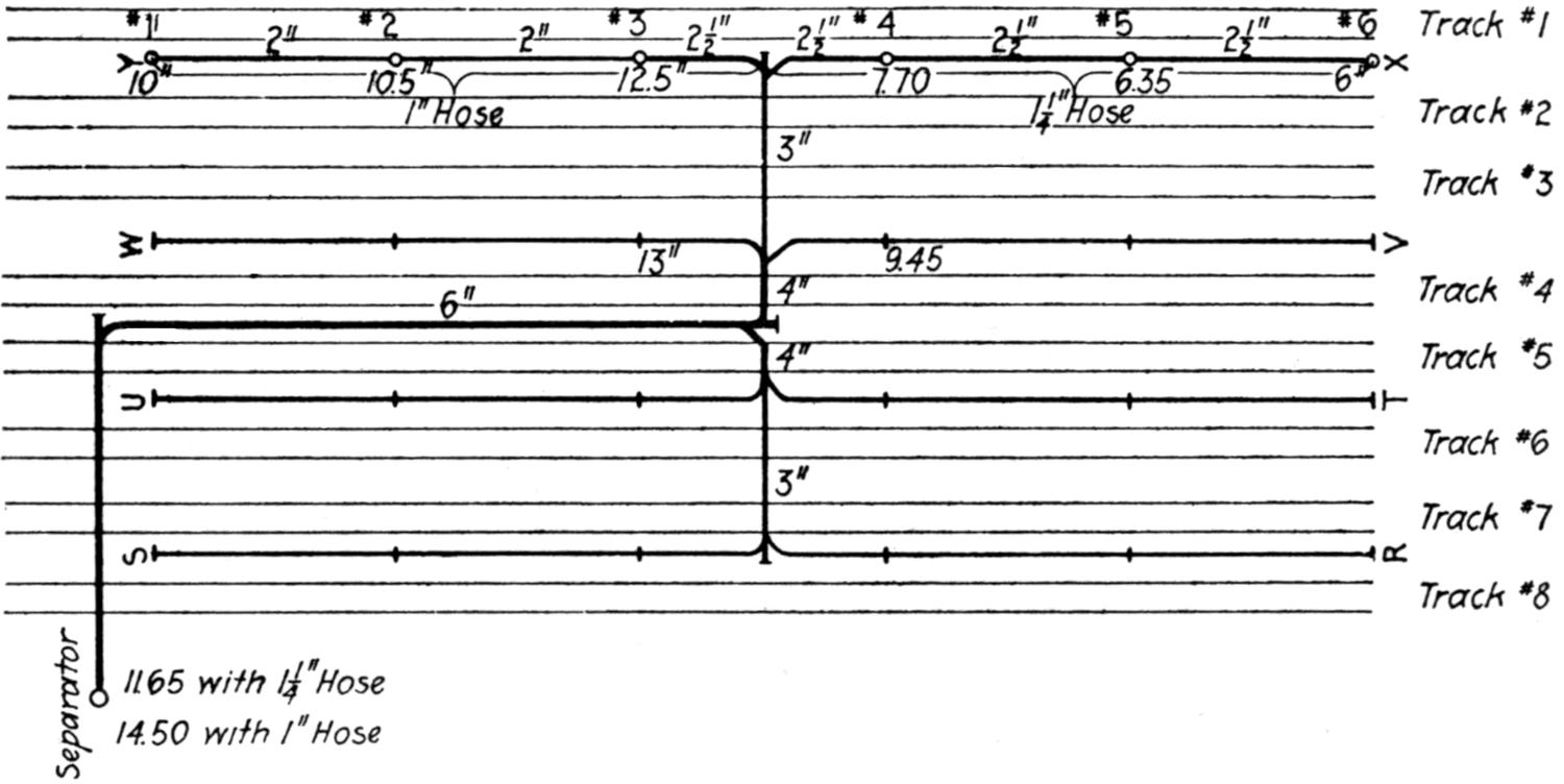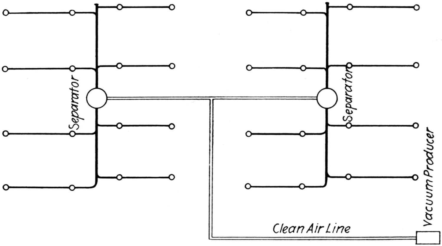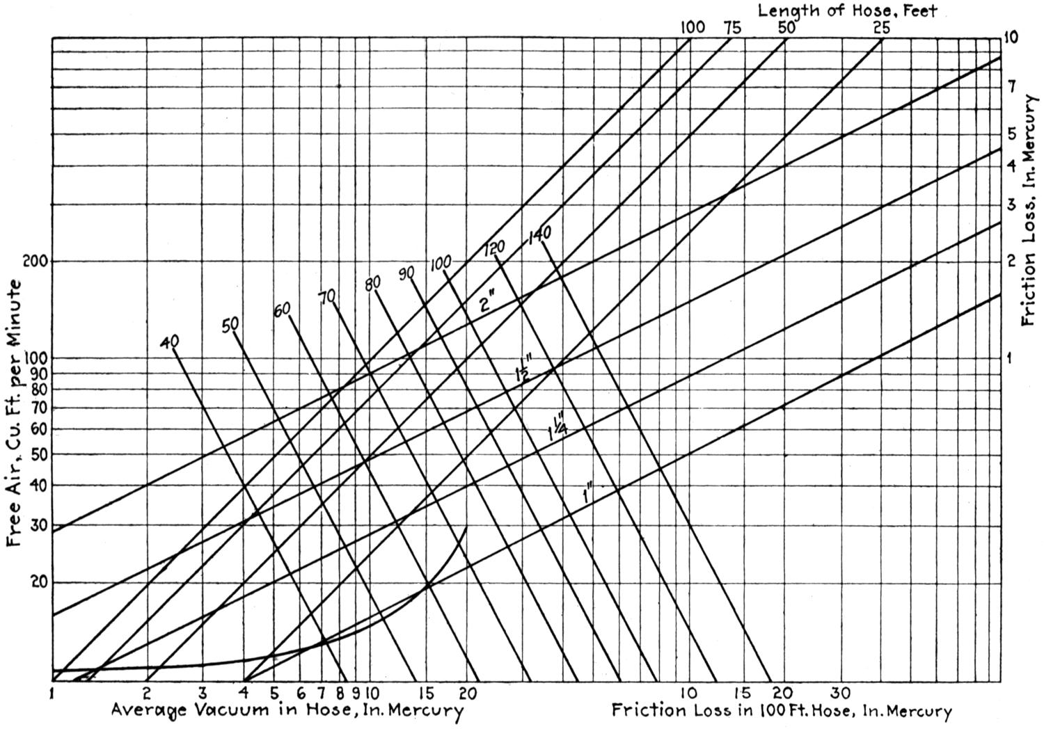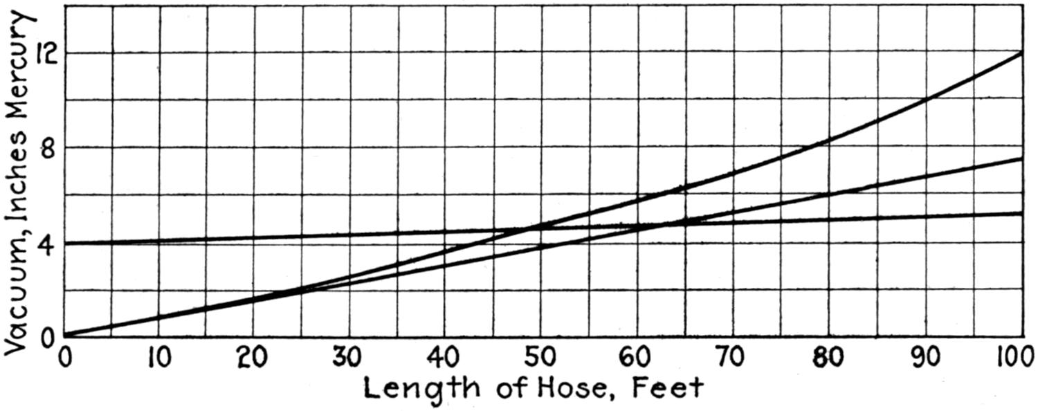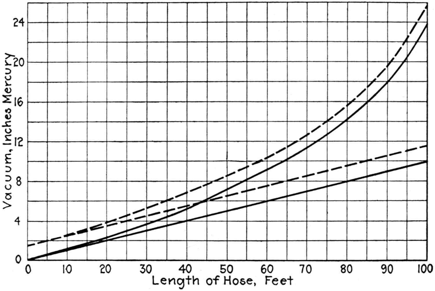 75. To test the capacity of plant, one hose line 100 ft. long shall be attached to inlet farthest from the separator, with standard vacometer with ¹⁄₂-in. opening in end of hose. Hose lines shall be attached to other outlets, each with 50-ft. hose and vacometer in end of hose, .... vacometers having ¹⁄₂-in. opening and .... vacometers having ⁷⁄₈-in. opening. Under these conditions 4 in. mercury must be maintained in vacometer at end of 100 ft. of hose.