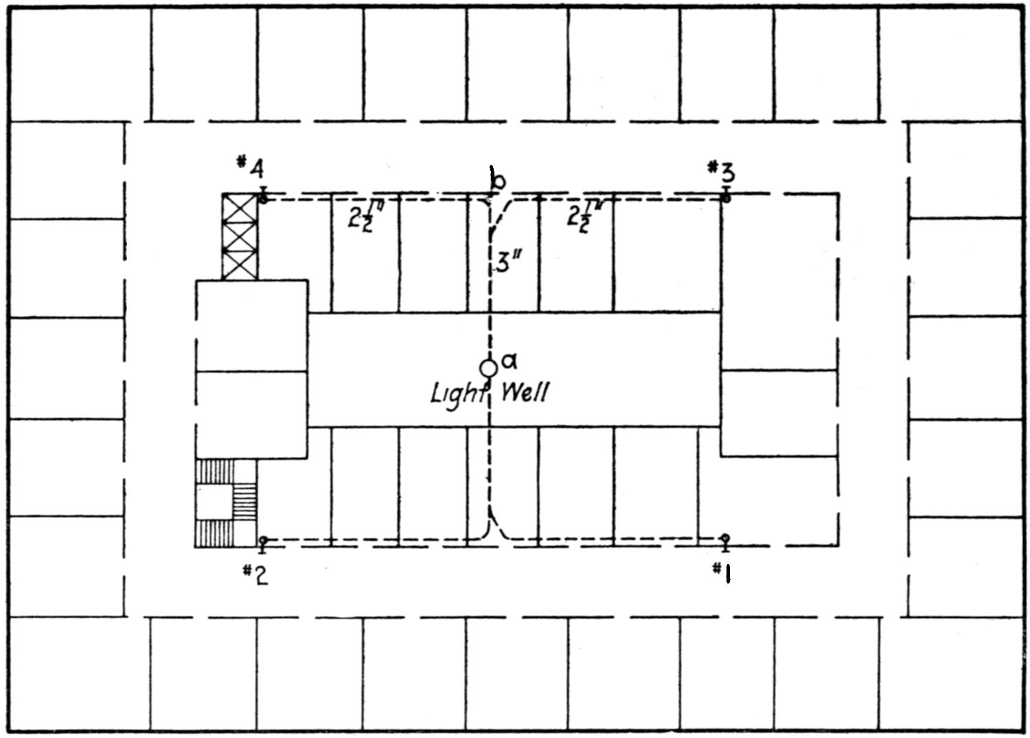 33a. Tablet. Furnish and place where shown, a slate tablet not less than ³⁄₄ in. thick, supported by a substantial angle bar frame, so placed that there will be a space of not less than 4 in. between the wall and back of resistance. Mount on the tablet one double-pole, 250-volt knife switch, with two 250-volt enclosed fuses and one starting rheostat, as specified hereinbefore. The connections shall be on the back of the tablet. The space between the column and the tablet shall be enclosed[221] with a removable diamond-mesh grill of No. 10 iron wire in channel frame.