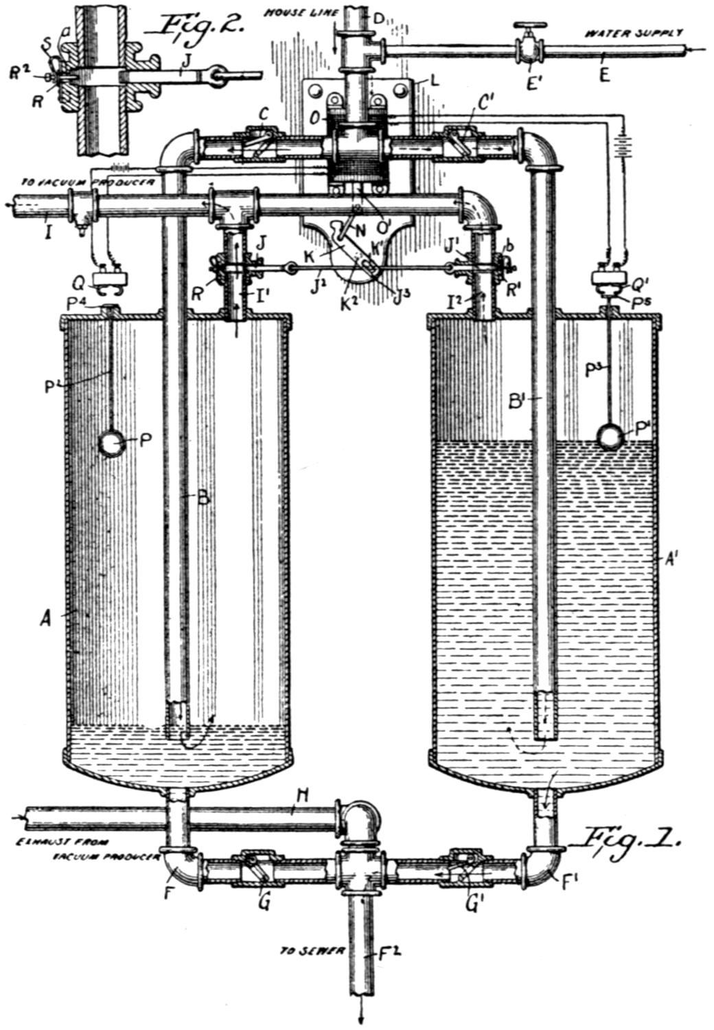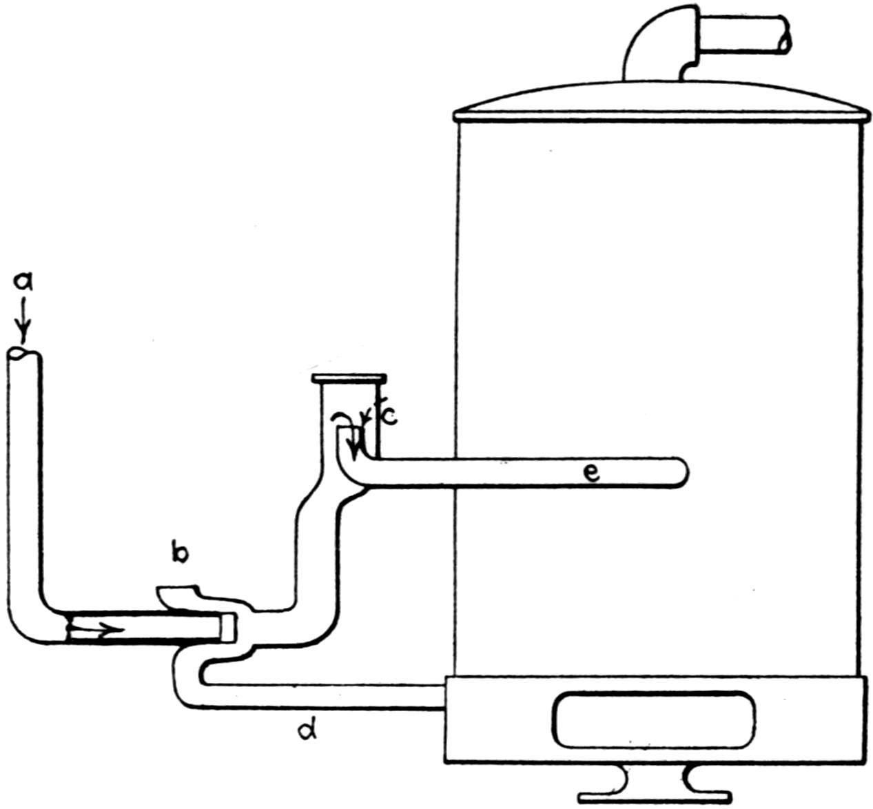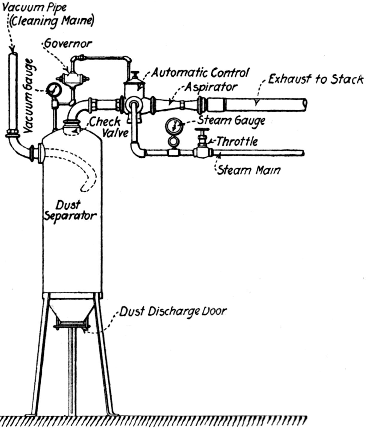 If the purchaser feels that he cannot afford to pay more than $125.00 for his vacuum cleaner, a type such as the Water Witch can be furnished for this price. This cleaner is placed in the basement, with arrangements for starting same from any floor. The manufacturers state that this apparatus produces a vacuum of 2 in. mercury in a carpet renovator, 4 in. mercury in an upholstery renovator and exhausts 25 to 30 cu. ft. of free air per minute with open hose. The machine operates by water pressure and the manufacturers state that it requires about 6 to 8 gals. of water per minute. All air is exhausted outside of the building and all dust washed down the sewer with the exhaust water. It is therefore, a fairly efficient and sanitary cleaning system.
