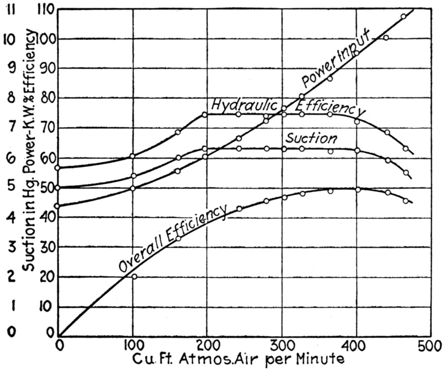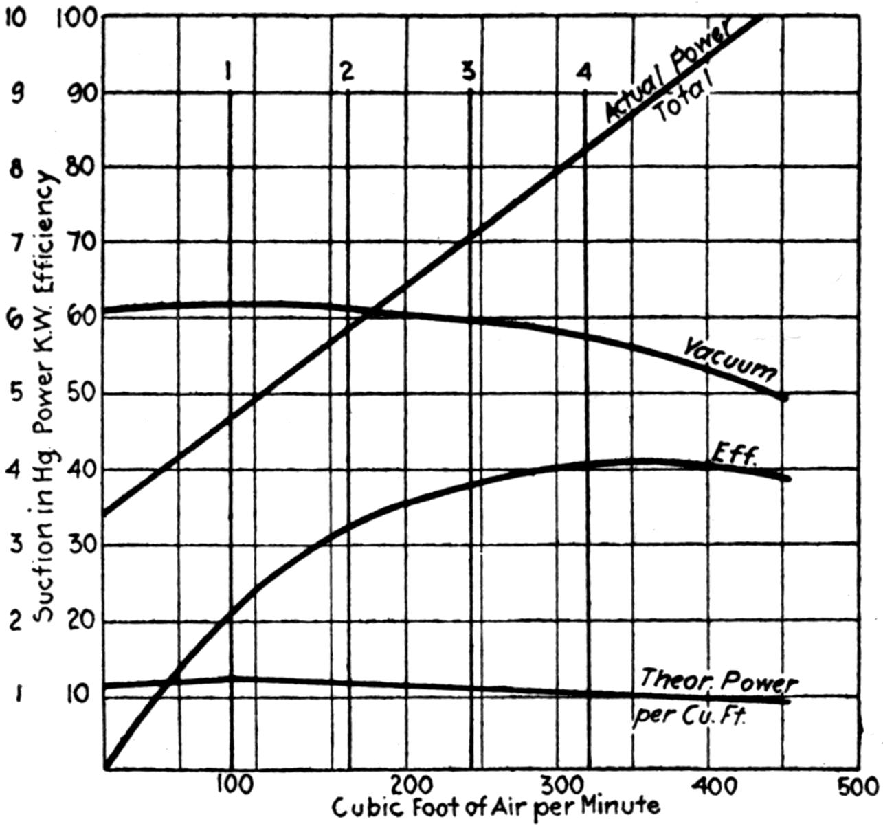 Machines using a multi-stage fan will produce a maximum vacuum of approximately 2 in. of mercury when exhausting no air, and will produce a vacuum of approximately 1 in. of mercury when operated on an ordinary carpet. With an unrestricted inlet, they will exhaust from 40 to 50 cu. ft. of air per minute. When operated on a bare floor, they will exhaust approximately 30 cu. ft. of free air per minute. They are, therefore, more efficient floor cleaners than the pumps, but cannot do thorough carpet and upholstery cleaning, no matter how small the renovator.