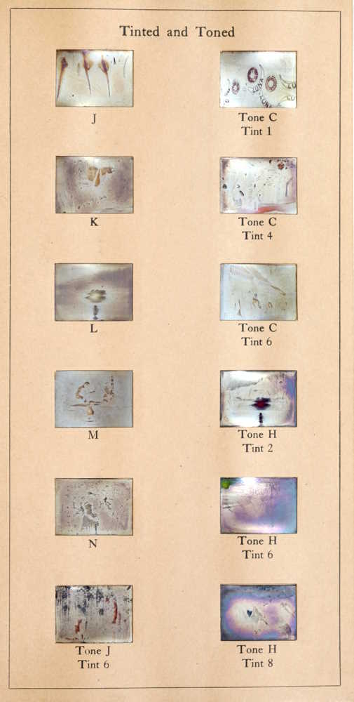 It is considered unnecessary to illustrate every combination of tone and tint above, so that only typical examples are given. It must be noted that toned film (except tones A and F) absorbs the dye more quickly than untoned film, so in order to duplicate appended samples, the dye-baths should be diluted accordingly.