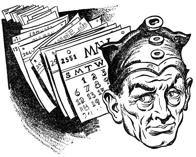 He tried to think back. At one time he had known the mechanism thoroughly. As an engineer he was completely familiar with every single plate and tube, but now he couldn't remember anything but the general appearance of the finished machine. Fear spurred his mind as he hunted for a solution. Something was happening to his mind. He began to think of his stories. The same thing had happened there. At one time he remembered every detail of life in the 25th century, and could describe them easily. Now events were dim and he knew now why his recent stories were poor. They were not written from actual memory of the future, but were the ordinary stories one might expect from a 20-year-old boy. The past was dim and memory faded. Blascomb and Crane, Crane and Blascomb, which was the C.D. agent, and what was C.D. anyway?
