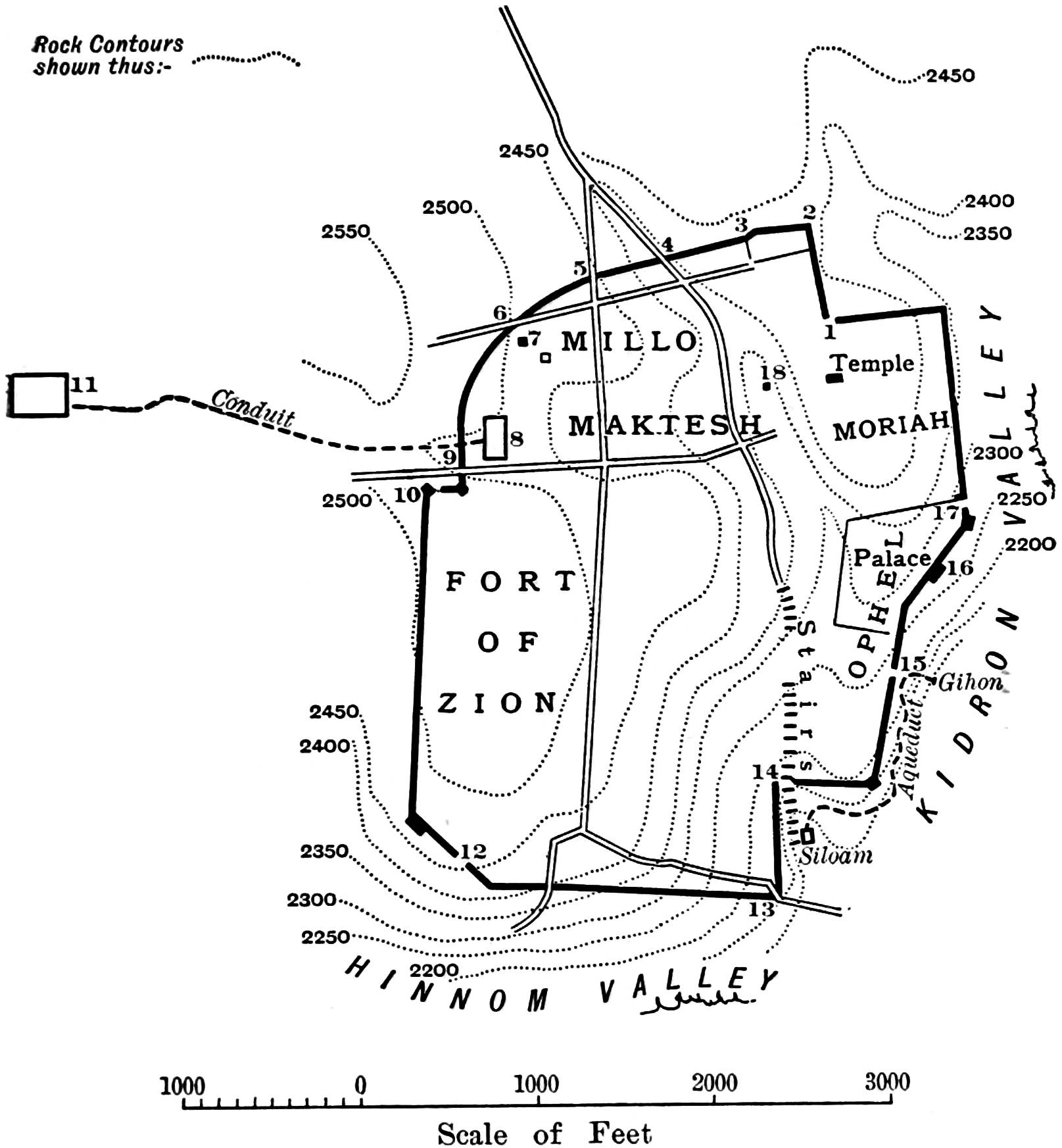Recent visitors have felt themselves perplexed by conflicting statements as to the Bible sites—“Two Zions, two Temple areas, two Bethanys, two Gethsemanes, two or more Calvarys, three Holy Sepulchres, several Bethesdas.”1 The statement is perhaps an exaggeration, and the discrepancies as a whole are by no means recent, being due to ancient misunderstandings or conjectures. Tradition is overlaid by tradition in the long period of at least 3,400 years since Jerusalem first became a royal city of the Amorite. Jewish traditions were followed by those of Christians and Moslems, who were alike ill informed as to ancient history. The Crusaders brought in new ideas, and often rejected those of the Eastern Churches. The Franciscans, after 1300 A. D., were deprived of some churches, and the Pope sanctioned the transference4 of old sites to other places. It is true that some literary critics have recently tried to prove that the “city of David” was not a royal city on the mountain top, but a mere hamlet on the tail of the Temple ridge. They have unfortunately—as unconscious heirs of the prejudices of Voltaire—been misled (as in so many other cases) by fixing on a single allusion, while ignoring other accounts, and dismissing the statements of Josephus as merely “traditional”; but they have not given due consideration to the results of exploration, and they have shown but slight acquaintance with the scientific study of ancient architecture.2 As a rule, however, it is not the modern theorist but the ancient pilgrim who is responsible for the confusion; and the agreement reached already, on the more important questions of topography, has been the outcome of actual research and of monumental studies. No one seems now to doubt that the Temple stood on the top of the eastern ridge. The positions of Olivet and Siloam have never been questioned. Herod’s palace is placed by all in the north-west corner of the upper city, near the so-called “Tower of David,” and Antonia on the rock of the present barracks at the north-west corner of the Temple courts. There was a time when the differences of opinion were much greater. One theorist even went so far as to assert that Hebron was the true site of ancient Jerusalem. But the topography has hardly been changed since Nehemiah’s age. The two great citadels are still held as Turkish strongholds, the Temple is still a sacred enclosure, the upper and lower markets are still where they always were, and even the dung-hills5 outside the wall are close to the “Dung Gate” of Hebrew times. We may sweep aside the misconceptions due to vague literary statements, and found ourselves not on paper, but on rock and stone, on contemporary inscriptions and architectural remains.