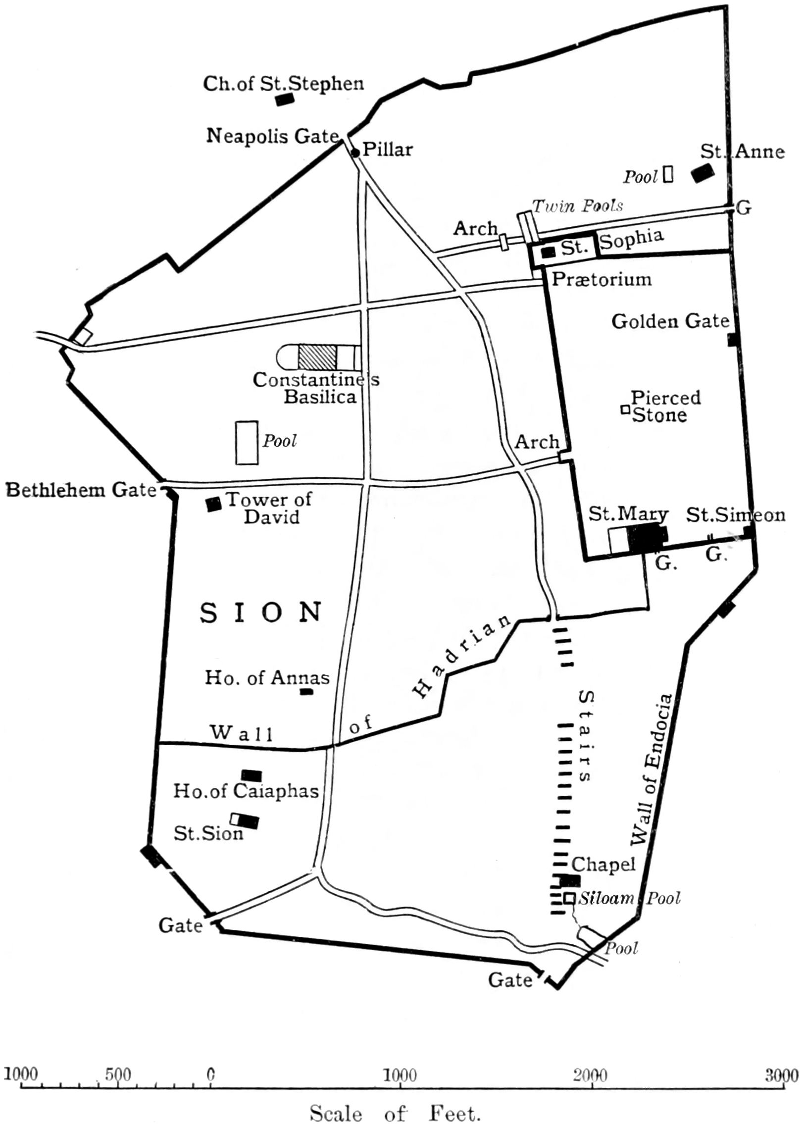 The sites in and round the Temple enclosure, and that of St. Stephen’s death, with some on Olivet, were equally liable to change in course of time. Thus the Pool of Bethesda has been traditionally pointed out in three separate places. From 333 A. D. down to 440 A. D. the “Sheep Pool,” or Bethesda, is placed at the “Twin Pools,” which still exist in the Antonia fosse,26 and which may have been cut out of the rock in the time of Herod or later. They are vaulted over with masonry, probably of the sixth century A. D., and gradually disappeared from sight as the level of the street was raised above them; thus already in the sixth century the “Sheep Pool” is placed at some distance from the “House of Pilate,” which17 immediately adjoined the “Twin Pools.”27 In the twelfth century Bethesda is always described as being at the “Piscina Interior,” or “inner pool,” a large rock tank west of the Church of St. Anne, which was rediscovered in 1888; but even in the thirteenth century the Templars were showing another site, namely, that which appears on the old map of Jerusalem (about 1308 A. D.), and which is the same now pointed out—the Birket Isrâîl, or “Pool of Israel.”28 There was considerable difference of opinion also as to where the Prætorium, or “House of Pilate,” should be placed. In the sixth century it was at the Antonia site, where Justinian built a chapel of St. Sophia—now the “Chapel of the Mocking”—inside the Turkish barracks. In the seventh and early in the twelfth centuries it was supposed to be on Mount Sion, but in the thirteenth it was replaced at the north-west corner of the Ḥaram.29