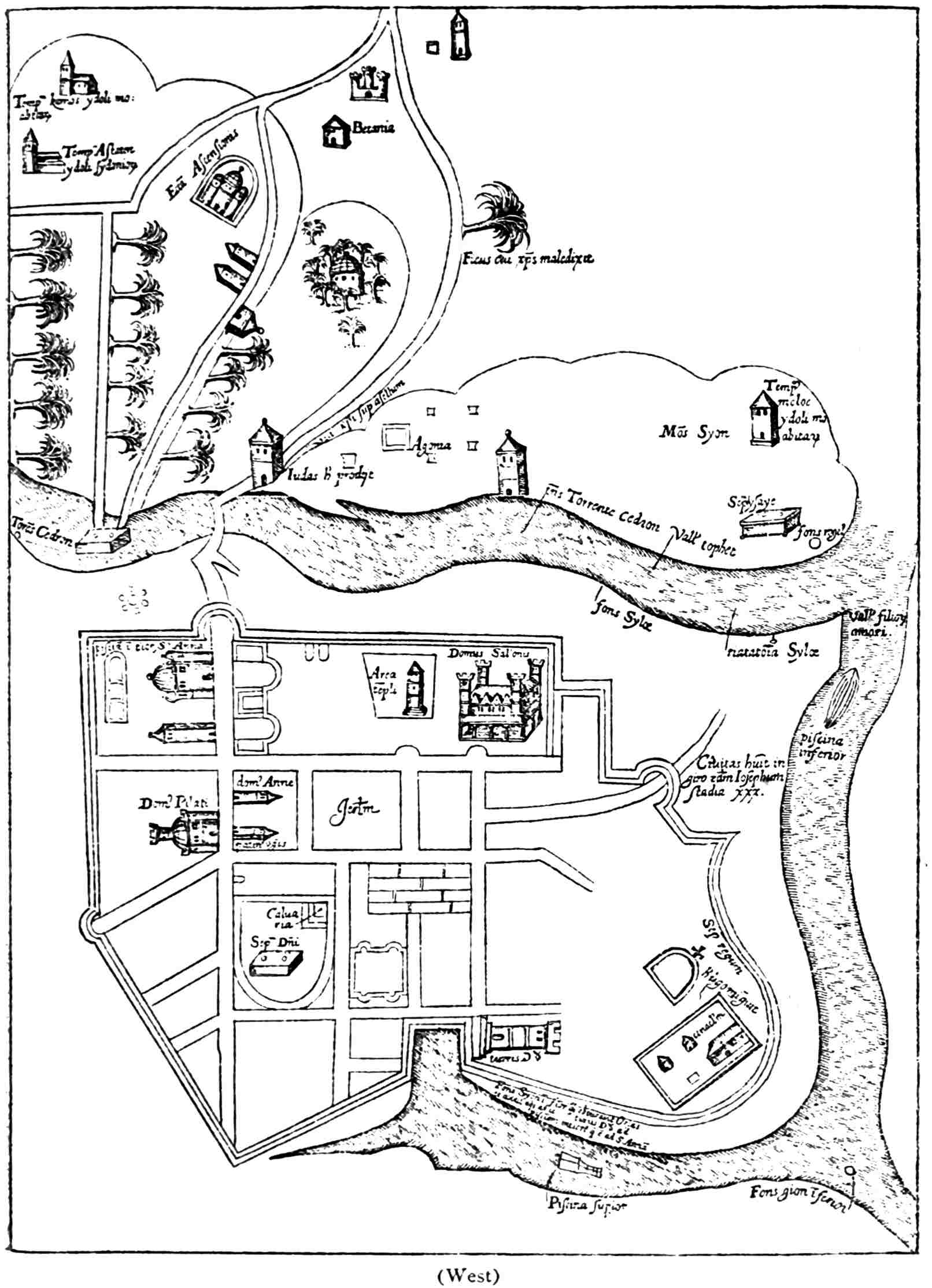 The ancient map of the city in the early years of the fourteenth century, which is to be found in the elaborate work of Marino Sanudo, has been already mentioned. This writer presented his book to the Pope, and was zealous in endeavouring to revive the enthusiasm of Europe for the recovery of Palestine, but his efforts met with no success. His map represents the Holy City much as it was in Saladin’s time. The House of Caiaphas and the Cœnaculum appear surrounded by the wall of the barbican. The Pool of Bethesda is shown in its present site at the Birket Isrâïl, and St. Stephen’s Gate is on the east instead of on the north; but the mediæval pool west of St. Anne is also marked as a “piscina.” The apocryphal “Upper and Lower Gihon” are shown on the west; the Church of the “Spasm” is at the corner where the Via Dolorosa bends south, just where its remains have now been found. These are the chief features of the map demanding notice.