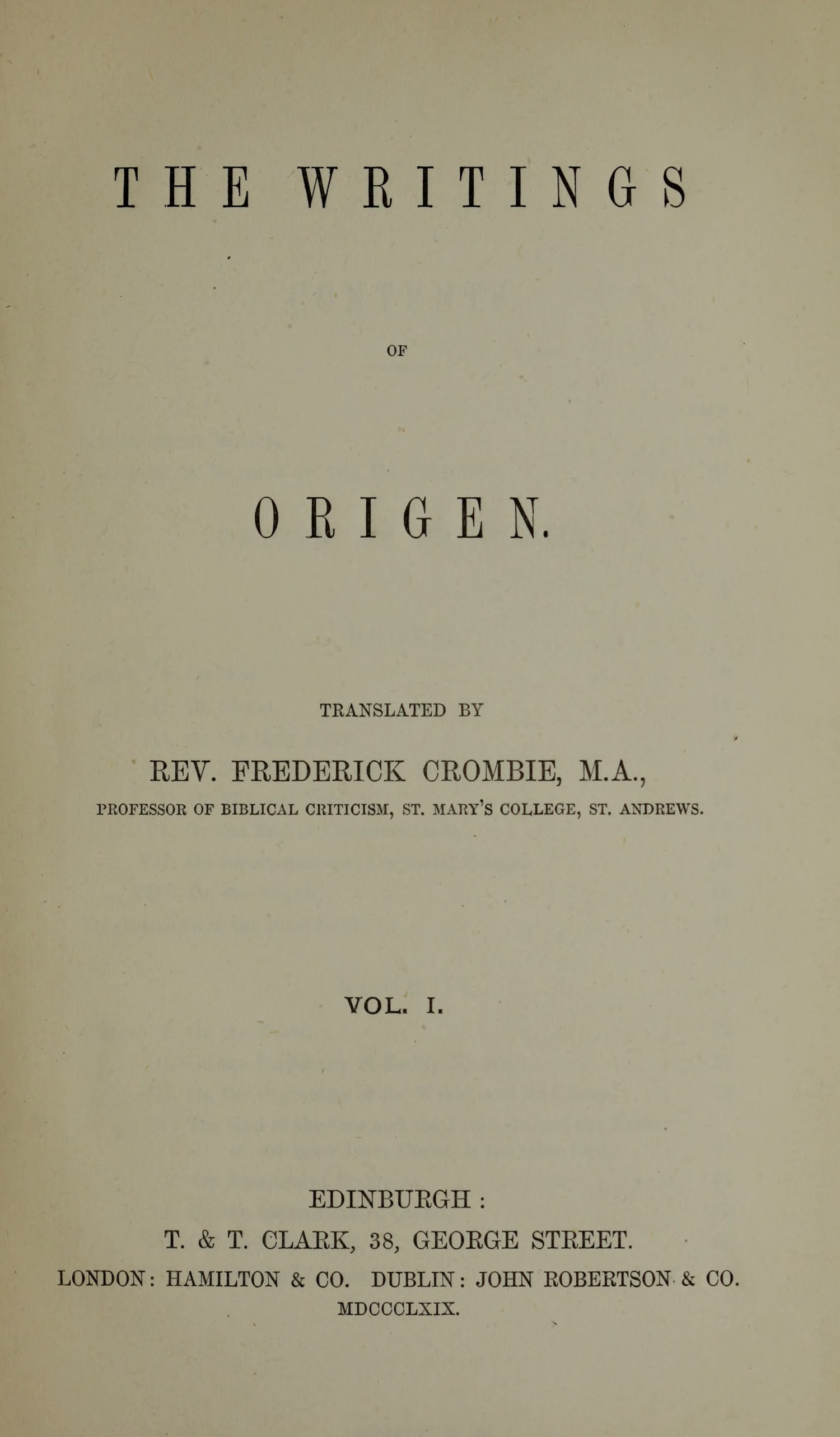 The name of the illustrious Origen comes before us in this volume in connection with his works De Principiis, Epistola ad Africanum, and Contra Celsum. Of these, the first two have been given entire, while of the third we have been able at present only to give the first book. A full account of the life and writings of the author will be prefixed to our next volume of his works. Meanwhile, we restrict ourselves to a brief notice of the three which have been mentioned.
