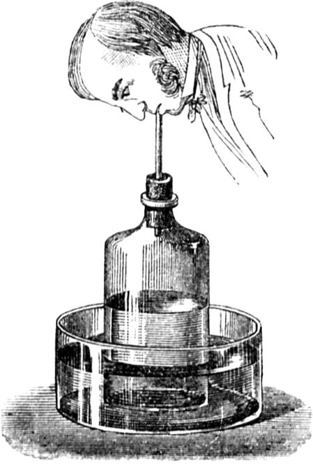 Jetzt werde ich Euch noch ein anderes Experiment zeigen, um Euch diesen wichtigen Teil unserer Untersuchung möglichst vollständig zu erläutern. Hier ist eine Glasglocke, die nichts als Luft enthält, was Ihr daran sehen könnt, daß meine Kerze oder die Gasflamme darin gleichmäßig fortbrennt. Ich verschließe sie mit einem Stöpsel und mittelst einer Glasröhre im Kork bringe ich meinen Mund so darüber, daß ich die darin enthaltene Luft einatmen kann. Wenn ich die Glocke auf Wasser setze, wie Ihr es hier seht, so bin ich imstande, die Luft herauszuziehen (natürlich muß der Kork ganz luftdicht schließen), sie in meine Lungen gelangen zu lassen und sie dann zurück in das Gefäß auszuatmen. Nun können wir sie untersuchen, um den Erfolg zu erfahren. Daß ich die Luft zuerst aussog und sie dann zurückatmete, konntet Ihr deutlich an dem Auf- und Niedersteigen des Wassers beobachten. Ich bringe nun einen brennenden Wachsstock in diese ausgeatmete Luft, und ihr werdet ihren Zustand an dem Verlöschen der Flamme erkennen. Ein einziger Atemzug hat diese Luft, wie Ihr seht, vollständig verdorben, so daß es ganz nutzlos sein würde, sie nochmals einatmen zu wollen. Nun begreift Ihr auch den Grund der Unzweckmäßigkeit vieler Einrichtungen in den Häusern besonders der ärmeren Klassen, welche es bedingen, daß dieselbe Luft immer und immer wieder eingeatmet werden muß, weil der Mangel geeigneter Ventilation die Zufuhr frischer Luft[181] erschwert. Wenn schon ein einziger Atemzug die Luft so verdirbt, wie Ihr es hier gesehen, wie wesentlich muß da für unsere Gesundheit frische Luft sein!