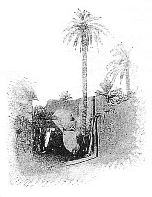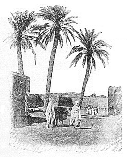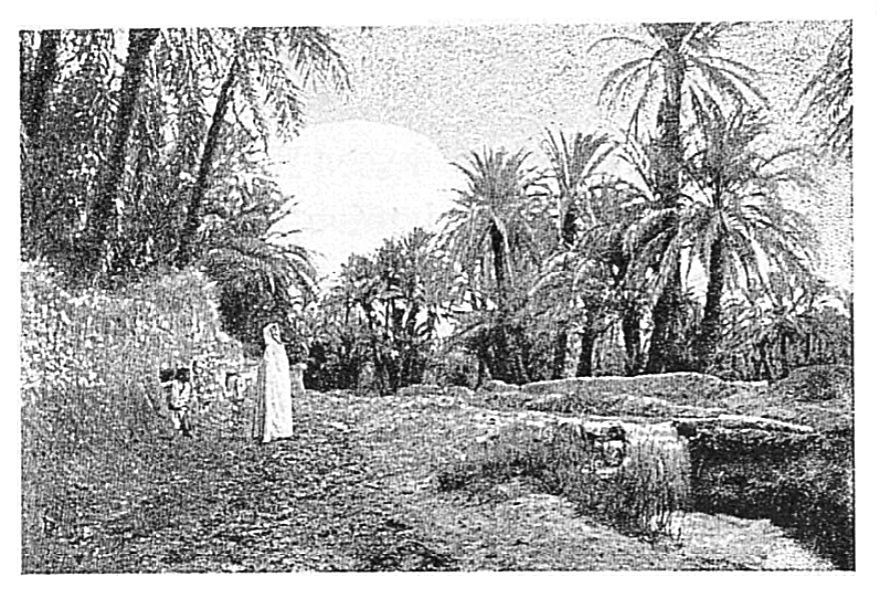 Ces jardins sont enclos de murs en terre. On y pénètre par des portes si basses que l’on n’y peut entrer qu’à plat ventre, en rampant ; les verdures y semblent d’une fraîcheur délicieuse. Ils sont plantés dans cette région de palmiers, de figuiers, de grenadiers et de lauriers-roses. La vigne court d’un arbre à l’autre, franchit les allées de sable fin. Dans le potager, les choux et les salades font une ceinture aux couches de pastèques. Tous ces plants sont reliés entre eux par un système très savant de petits canaux qui tournent autour des arbres et viennent se déverser, à l’entrée comme à la sortie du jardin, dans une artère principale qui crève la muraille. Selon la richesse du propriétaire, l’eau lui est donnée deux fois par jour, ou seulement une fois, ou même un jour sur deux. Et cette répartition est réglée avec une impartialité, une ingéniosité de moyens tout à fait surprenantes.
