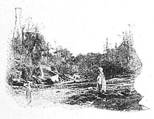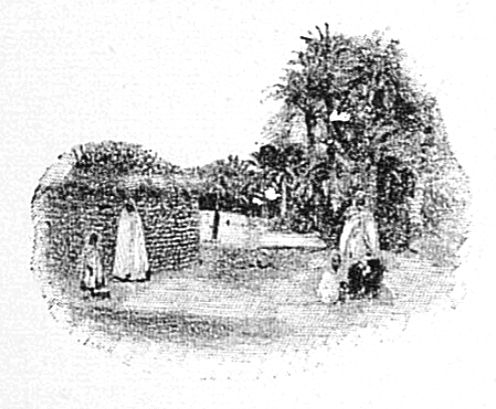 A l’instant ce personnage revêt son burnous le plus propre et il s’avance à notre rencontre suivi de quelques anciens de la tribu. Arrivé en notre présence, il nous touche la main droite qu’il porte ensuite à ses lèvres et à son cœur ; c’est la formule usuelle du salut. Il accompagne généralement cette politesse de quelques paroles emphatiques à la louange de ses hôtes ; il y joint volontiers des protestations de fidélité et manifeste le désir de recevoir les voyageurs dans sa propre maison. Il se montre très vexé d’apprendre que nous préférons passer la journée dans un jardin, en plein air, et que nous refusons absolument la diffa pour nous et pour notre suite.