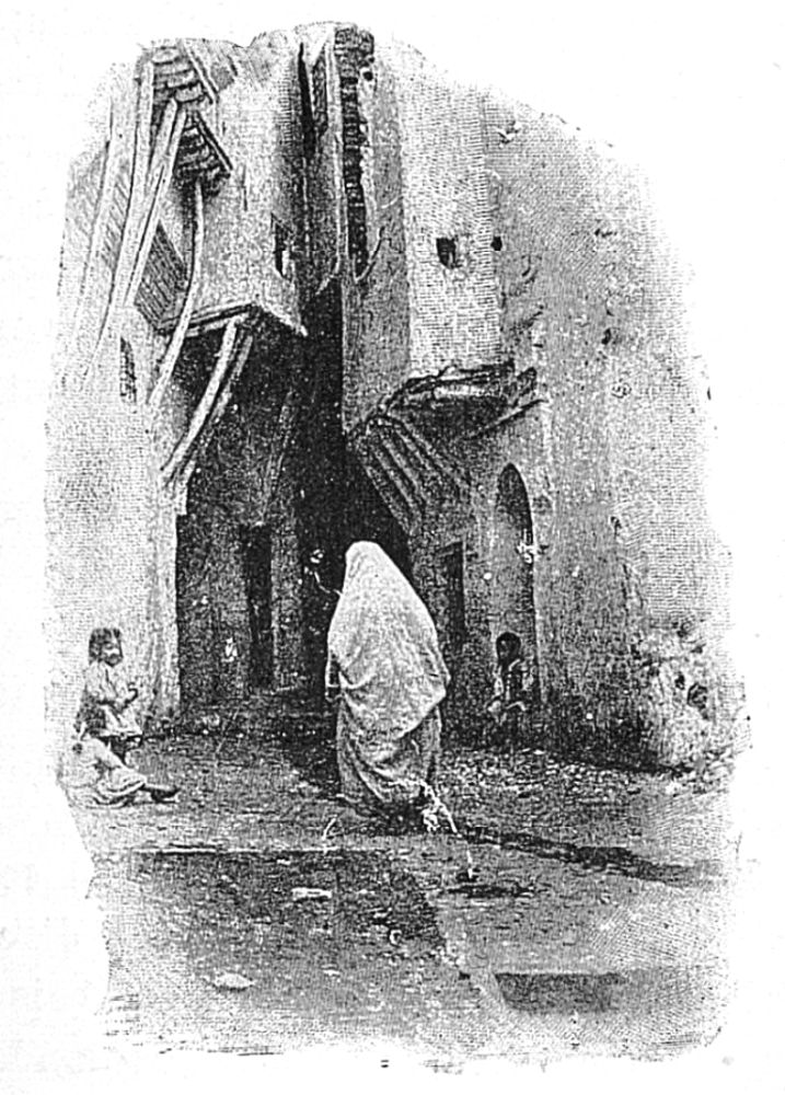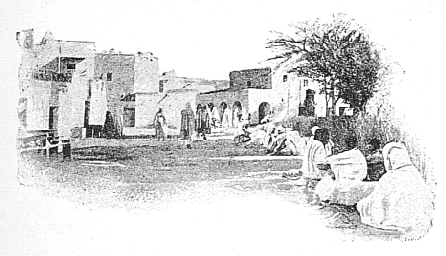 Cette surveillance terminée, le ksourien n’a plus rien à faire. Il laisse à son esclave nègre le soin de relever les petits pans de digue que la violence du courant d’eau à culbutés. Lui-même il va s’asseoir dans quelque rue du ksar, à l’ombre que jette dans le chemin, par-dessus la voie, l’enjambement d’un étage de maison. Sous cet abri que forment les poutres de palmier, supportant un plancher de lattes, des bancs sont installés de chaque côté de la ruelle. Dans chacun de ces endroits-là, des parlottes s’organisent. On est assis confortablement en tailleurs. On s’évente des mouches avec une aile de charognard. La conversation est alimentée par le hasard des passages : c’est un âne, pliant sous les fagots, dont on critique le chargement. Un jeune homme traverse avec une brebis sur les épaules, qu’il va vendre. On l’arrête, on lui fait décharger sa bête, on la palpe soigneusement, on apprécie la laine et la viande, on demande le prix, que l’on déclare exagéré, et on n’achète pas.