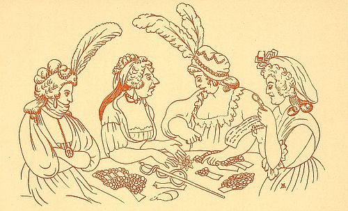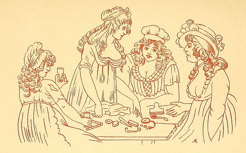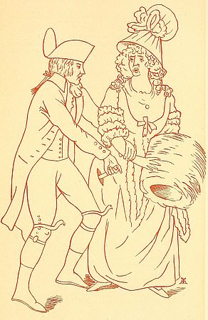 "It appears that they have made good harvest, this summer, of female credulity, and have often gained a guinea on a Sunday. Not only young girls, panting for matrimony, have been their dupes, but the well experienced dames, curious to trace the steps of their dear spouses, have paid liberally for discovery, as the following story will prove: On Thursday, as two Gentlemen, who dined at Norwood, were looking out of a window, they observed a respectable, well-dressed woman in deep consultation, for a sum paid to the old gypsey. They observed the good woman greatly agitated, and heard her ask 'If she was sure it was true'? On being answered 'As sure as God was in heaven' she gave the gypsey a further sum, (p. 333) and made further enquiry, and at last gave her a good pocket-handkerchief, and departed seemingly full of vengeance. The gentlemen, curious to learn the nature of the good woman's consultation, sent for the old gypsey, who candidly told them, that she enquired of her if her husband was continent, and that she answered he was not, and thereby obtained three presents instead of one."—(Times, Aug. 22, 1797.)