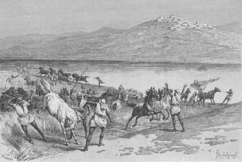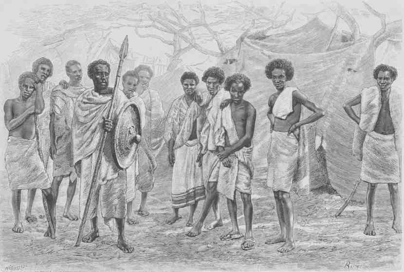 L'intendance de l'armée du Choa me paraît aussi devoir être prônée. Une troupe, forte de cinq à six cents soldats, vient-elle à s'ébranler, elle se fait précéder de milliers de femmes qui charrient les vivres, les munitions et les bagages des combattants. Ceux-ci s'avancent graves et nobles, fièrement campés sur leur cheval de bataille, et ne s'embarrassent même pas de la lance et du bouclier, que des esclaves tiennent à leur disposition.