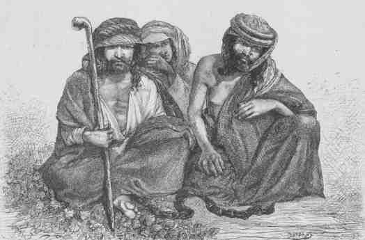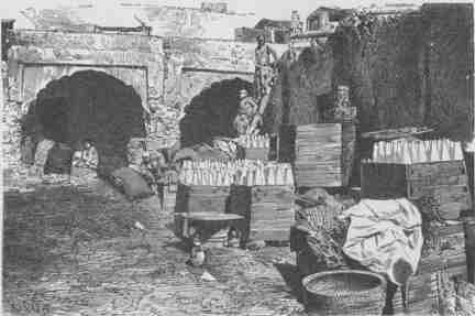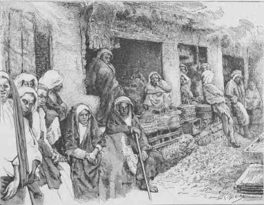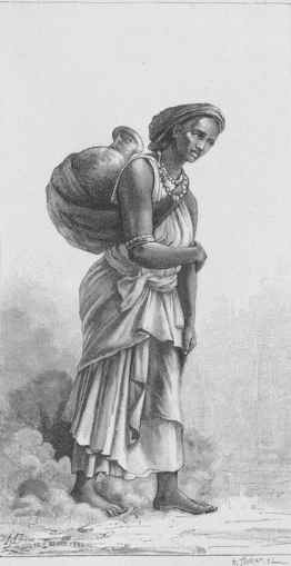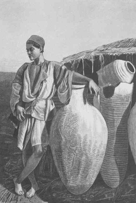 Encore un espace rocheux, puis apparaît un grand hôpital, construit avec les matériaux arrachés à la falaise. A droite poussent des buissons, plus bas et plus touffus que les tamaris venus sous l'œil protecteur du gouverneur. La plus haute branche de chacun d'eux est couronnée d'un vieux vase. Cette potiche ainsi placée indique que l'arbre est habité. Sous les rameaux de l'une de ces maisons primitives, j'aperçois deux jeunes filles sommairement vêtues: la plus jeune écrase du blé en promenant sur une pierre dure un cylindre de porphyre aminci à ses extrémités; l'autre regarde travailler son amie.