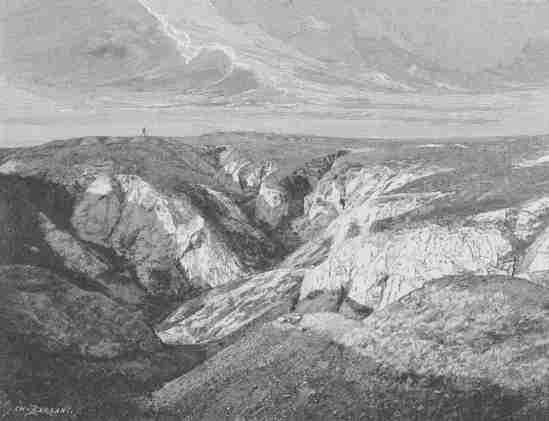 Bientôt les timoniers signalent le cap Ras-Bir. A l'horizon courent des montagnes qui s'étendent du nord-est au sud-ouest et s'infléchissent vers le sud entre Obock et Tadjoura. Cette chaîne, prolongement volcanique des côtes de la mer Rouge, s'appuie sur un plateau madréporique que soutiennent des falaises élevées. Le[Pg 6] plateau constitue le territoire d'Obock. Il fut acquis des chefs indigènes en 1862, par le commandant Fleuriot de Langle, et payé dix mille thalaris (cinquante mille francs). Sa superficie est de vingt-cinq lieues carrées.