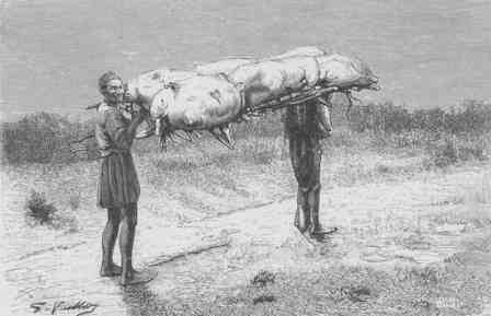 Ces mœurs sanguinaires s'harmonisent si bien avec le caractère de la race, qu'un homme ne saurait trouver femme s'il n'a prouvé sa valeur par l'assassinat de l'un de ses semblables. Les familles prévoyantes achètent même de vieux nègres affaiblis et les livrent à leurs enfants en bas âge; les chers bébés peuvent ainsi conquérir la plume noire et satisfaire sans danger à la loi cruelle de la tribu.