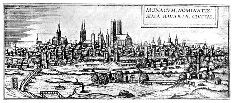 This is a large Catholic village, finely situated, and belonging to the duchy of Bavaria. We started on the morrow, Thursday, October 20, and after having traversed a vast plain of corn-land (for in this country no vines are planted), and then one of pasturage stretching as far as the eye could see, we arrived, after four leagues’ journey, in time for dinner at Munich, a large city about the size of Bourdeaux, the capital of the duchy of Bavaria, and the principal residence of the dukes, situated on the river Yser, Ister.