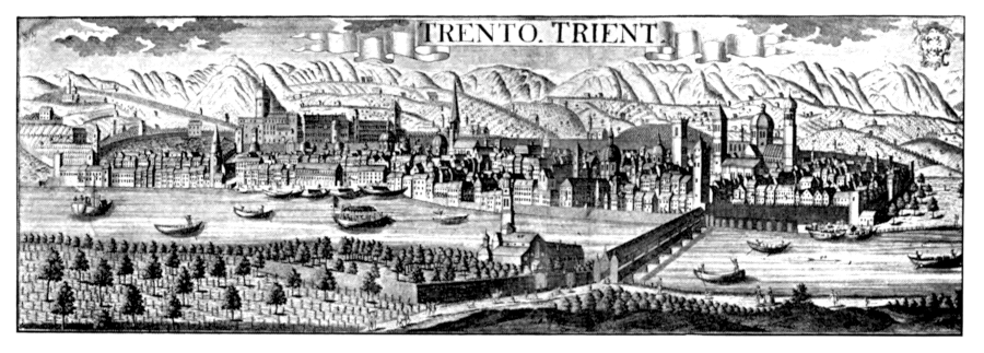 Trante is somewhat larger than Aagen, an unpleasant place, and quite lacking in the grace of the German towns, with narrow and crooked streets.108 Two leagues before reaching it we heard the Italian tongue, and the town itself is equally divided between the two languages, one quarter thereof being called after the Germans, with a church in which they have a preacher of their own speech. We heard no talk of the new forms of religion[Pg 182] after we left Augsburg. In Trante, which is on the Adisse, we saw the cathedral, which had a look of great antiquity,109 and the same may be said of a square tower near thereto. We likewise visited Notre Dame, the new church where the Council was held, in which church there is an organ, the gift of a private gentleman. This is exceedingly beautiful; it is set up in a marble gallery which is carved and adorned with divers fine statues, those of some singing children being especially lovely.110 This church was built by Bernardus Clesius Cardinalis in 1520, a native of Trante and afterwards bishop.111 Trante is a free town under the charge and governance of the bishop, but at a time when they were hard pressed in a struggle with the Venetians, the people called in the Count of Tirol to help them, and in return therefor he has retained[Pg 183] certain authority and rights over the town. There has been a contention between him and the bishop over this matter, but the bishop, who is a Cardinal Madruccio, now holds possession.112