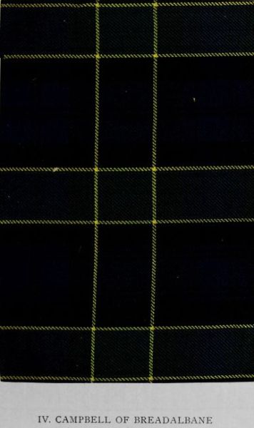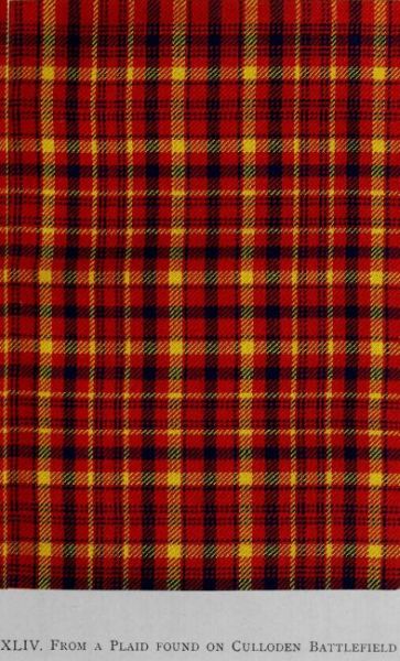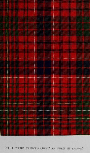 Various circumstances tend to enhance the interest of this design, which is especially associated by Jacobite enthusiasts with the memory of Prince Charles Edward, and which was named during the campaign of 1745-46 from his personal use of it. Authenticated by specimens of contemporary and immediately subsequent dates—invariably bearing the legend of royal adoption—the tartan may be ranked amongst the earliest clan patterns extant in fabric. It is undoubtedly an old pattern of the Mac Raes; and it was certainly worn by the Prince in their territory. But whether it was previously used by members of the clan, or whether it was adopted by them as a compliment to the wearer, cannot be determined. Tradition indicates, however, that the Prince was wont to don the local colours of the various clans in his sojournments in their respective districts. It is now generally known as Mac Rae; but in all representations hitherto published the omission of the yellow lines has produced confusion as to the true sett.