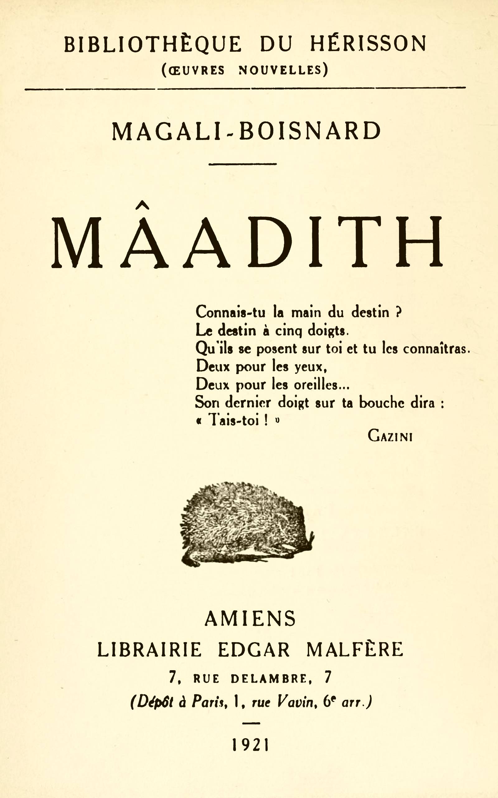 Connais-tu la main du destin ?Le destin a cinq doigts.Qu’ils se posent sur toi et tu les connaîtras.Deux pour les yeux,Deux pour les oreilles…Son dernier doigt sur ta bouche dira :« Tais-toi ! »Gazini