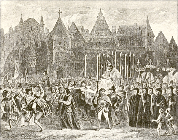Le peuple affluait surtout dans les avenues du Palais de Justice, parce qu’on savait que les ambassadeurs flamands, arrivés de la surveille, se proposaient d’assister à la représentation du mystère et à l’élection du pape des fous, laquelle devait se faire également dans la grand’salle.