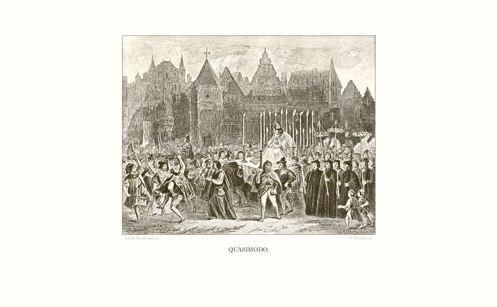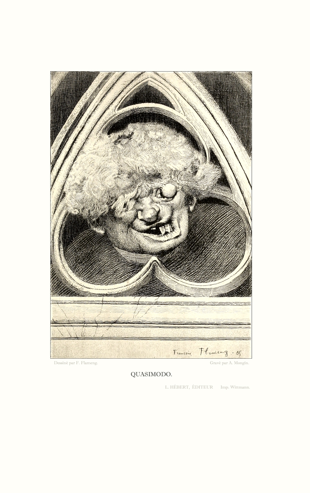 Il y avait entre autres un groupe de ces joyeux démons qui, après avoir défoncé le vitrage d’une fenêtre, s’était hardiment assis sur l’entablement, et de là plongeait tour à tour ses regards et ses railleries au dedans et au dehors, dans la foule de la salle et dans la foule de la place. A leurs gestes de parodie, à leurs rires éclatants, aux appels goguenards qu’ils échangeaient d’un bout à l’autre de la salle avec leurs camarades, il était aisé de juger que ces jeunes clercs ne partageaient pas l’ennui et la fatigue du reste des assistants, et qu’ils savaient fort bien, pour leur plaisir particulier, extraire de ce qu’ils avaient sous les yeux un spectacle qui leur faisait attendre patiemment l’autre.