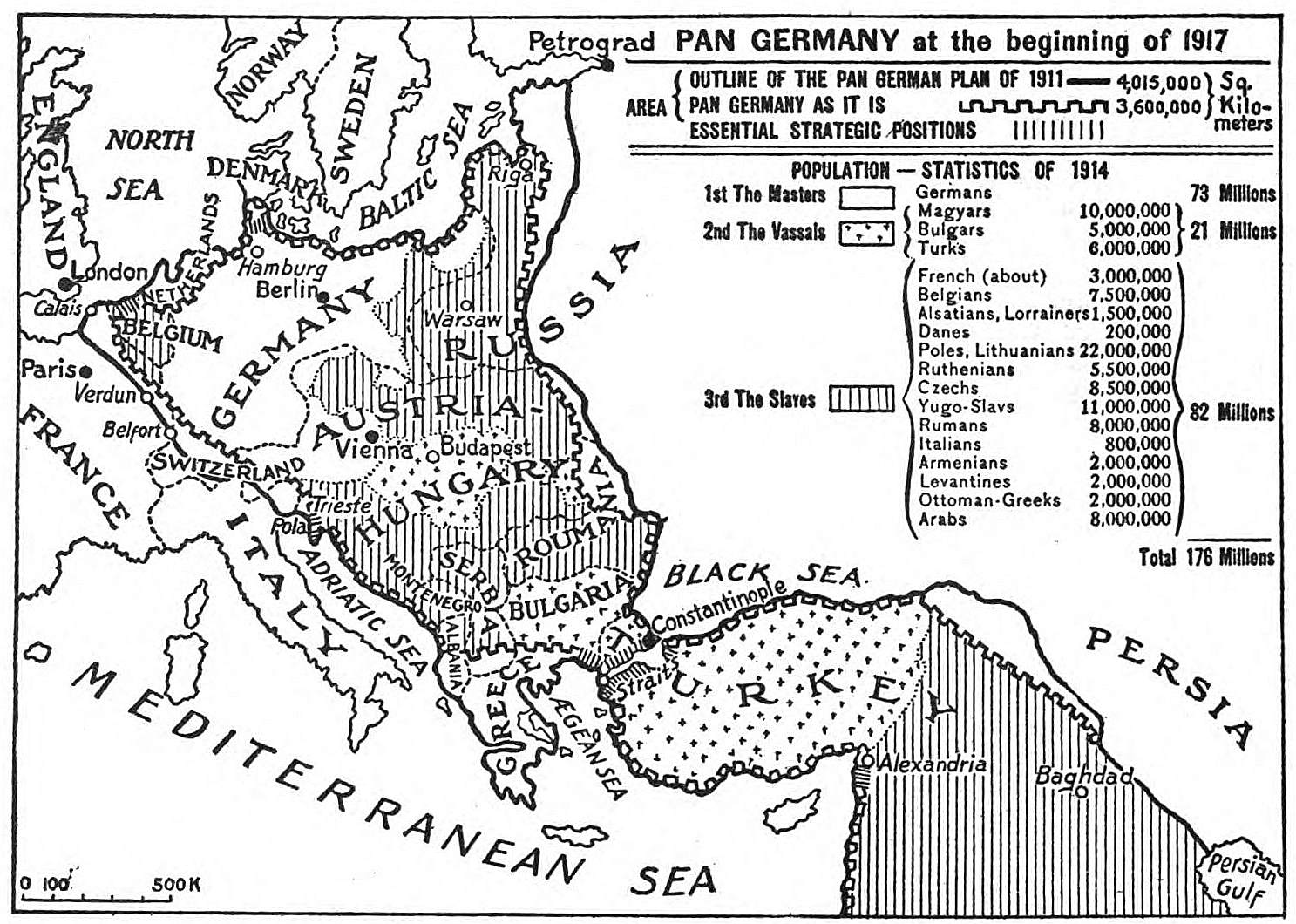 Very often we hear it said, ‘Germany has created Mitteleuropa.’ This is another mistake. Geographically speaking, Mitteleuropa includes only Central Europe; and Germany’s dominion is infinitely further flung, extending as it does from the west front in France to the British front before Bagdad. If we wish to see things in the light of reality, we must say, for the present at least, ‘There is no longer any Germany; instead, there is Pan-Germany.’ This is an essential assumption if we are to reason justly. The map of Pan-Germany at the beginning of 1917, which is printed above, shows clearly the essential, but all-too-little-known elements of the present situation, which is characterized by the fact that 73 million Germans, aided by 21 million vassals,—Magyars, Slavs, and Turks,—have reduced to slavery 82 millions of Latins, Slavs, and Semites, belonging to thirteen different nationalities. Pan-Germany, which has now almost completely reached the limits set by the Pan-German plan of 1911, consists, therefore, of one vast territory containing about 176 million inhabitants and natural resources of the greatest variety.