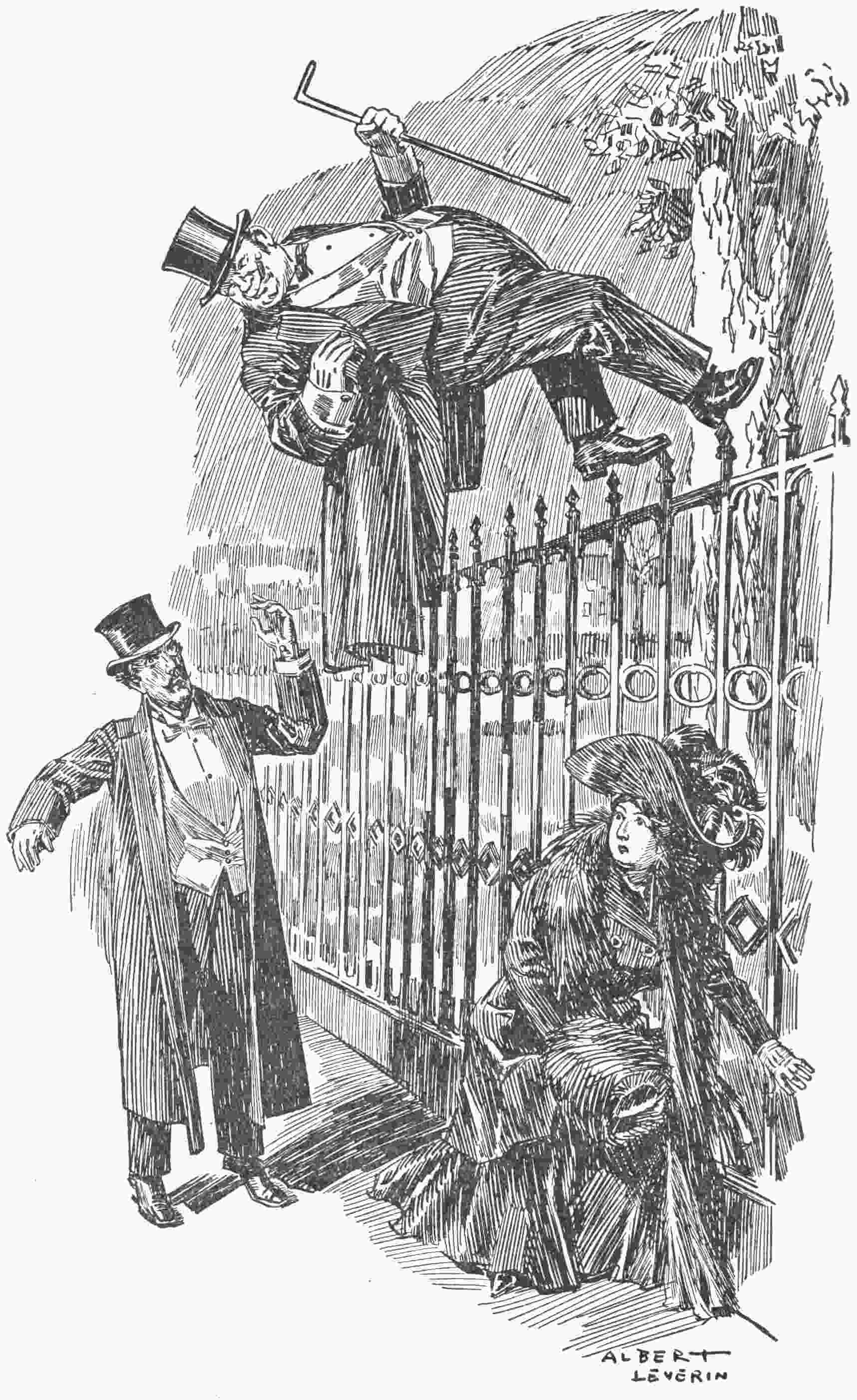 My wife and Walsingham tried to dissuade me, but I climbed to the top of the fence. I not only walked on the points of the pickets easily, but I was able to place the end of one toe on the point of one picket, and thus balanced wave the other leg in the air. My wife and Walsingham Gribbs coaxed me to come down to the level of the walk, but as I saw no reason to do so, I flatly refused, and at last Walsingham reached up and took me by the hand and pulled me.