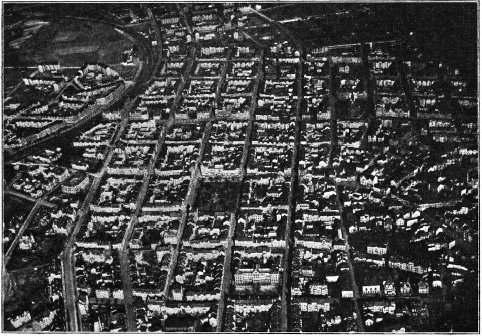 Noch deutlicher tritt diese schematische Raumaufteilung bei Bild 3 in Erscheinung: Plauen im Vogtland. Trostlos wirkt, von oben gesehen, eine derartige, an amerikanische Städte erinnernde Bauweise. Die Höfe der Häuserblöcke sind verbaut mit Hinterhäusern und Fabrikgebäuden, es kommt durch dieses Verbauen der Höfe nicht genügend Licht, Luft und Sonne in die Wohnungen, die in diesen Häusern sich befinden. Die Grundbedingungen also, die Gesundheit gewährleisten, bleiben unerfüllt. Die Bewohner derartiger Mietskasernen (die übrigens noch direkt harmlos gegen die Berliner Mietskasernen sind, bei denen vier bis sechs Höfe und Hinterhäuser hinter einem Vorderhaus liegen) müssen den Zusammenhang mit dem Grund und Boden, mit der Heimaterde verlieren – die verhängnisvollen Folgen[254] der seit 1870 betriebenen Spekulation mit Grund und Boden (Bodenwucher), die zwingt, hoch und eng zu bauen, treten auf diesem Bild deutlich zutage. Wer aber den Zusammenhang mit der Heimaterde verloren hat, wer in seiner »Wohnung« nur noch den Abstellraum für seine Möbel erblicken kann, der kann auch keine Heimatliebe mehr empfinden, weil er sich als ein Ausbeutungsobjekt andrer betrachten muß. Wir haben wirklich keine Veranlassung, verächtlich auf die Bauweise unsrer Vorfahren herabzublicken, die es viel besser verstanden haben zu bauen als wir.