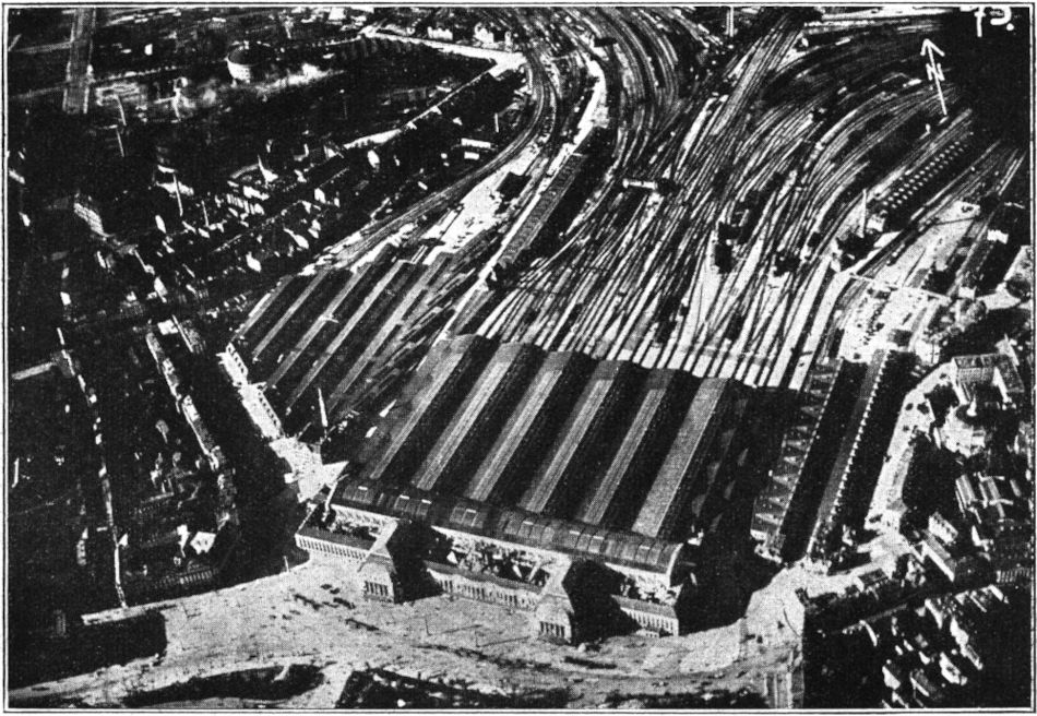 Daß aber auch in der modernen Zeit schön gebaut werden kann, daß auch die moderne Zeit den Anforderungen gewachsen ist, die die Entwicklung des Verkehrs stellt, ist aus dem nächsten Bild (Bild 5) erkennbar. Wir sehen vor uns den Hauptbahnhof von Leipzig – den größten Bahnhof Europas. Sechs große Bahnhofshallen nehmen den aus allen Himmelsrichtungen zu diesem Zentralpunkt zusammengeleiteten Verkehr auf, eine mächtige Querhalle verbindet diese sechs Hallen, von dieser Querhalle aus wird dann der auf sechsundzwanzig Bahngleisen in die Großstadt hereinbrausende Nah- und Fernverkehr aufgesogen und verteilt. Ein Blick auf die wohlgeordnete – den Laien auf den ersten Blick vielleicht verwirrende – Gleisanlage zeigt die gesamten eisenbahntechnischen Anlagen deutlicher und übersichtlicher als man das alles übersehen kann, wenn man im Zuge schnell an alledem vorüberflitzt. Auch vor dem Bahnhof herrscht lebhafter Verkehr – wir erkennen das an den zahlreichen Straßenbahnen, Autos, Droschken und – sogar einzelnen Menschen.