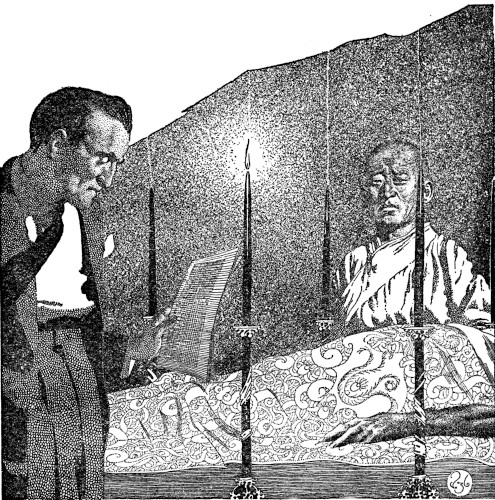 Mists of horror engulfed me. I was dimly aware of Conrad's voice droning on and on, both in English and in that other fearsome tongue whose horrific import I scarcely dared try to guess. And with stark fear clutching at my heart, I saw the candles go out, one by one. And with each flicker, as the gathering gloom darkened about us, my horror mounted. I could not speak, I could not move; my distended eyes were fixed with agonized intensity on the remaining candle. The silent oriental at the head of that ghastly table was included in my fear. He had not moved nor spoken, but under his drooping lids, his eyes burned with devilish triumph; I knew that beneath his inscrutable exterior he was gloating fiendishly—but why—why?
