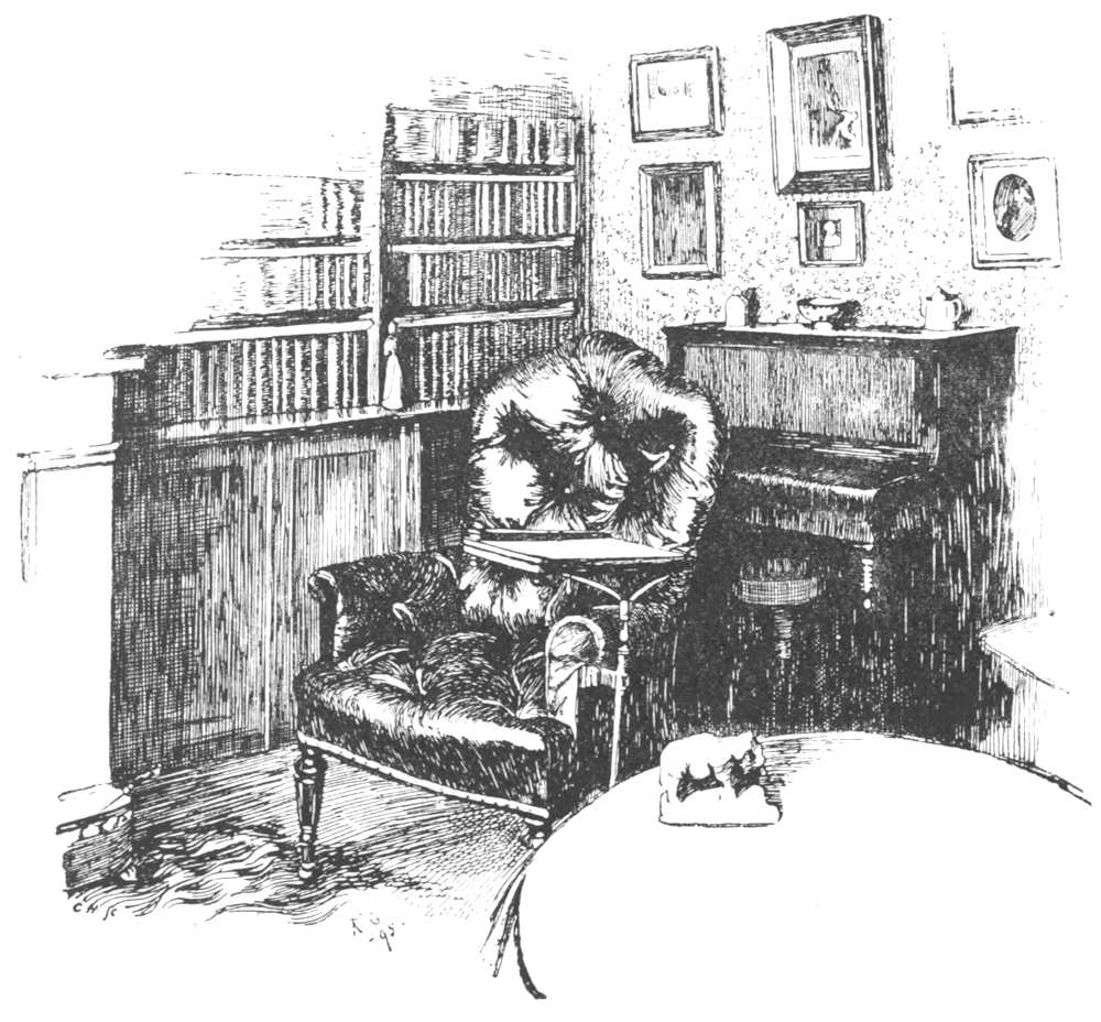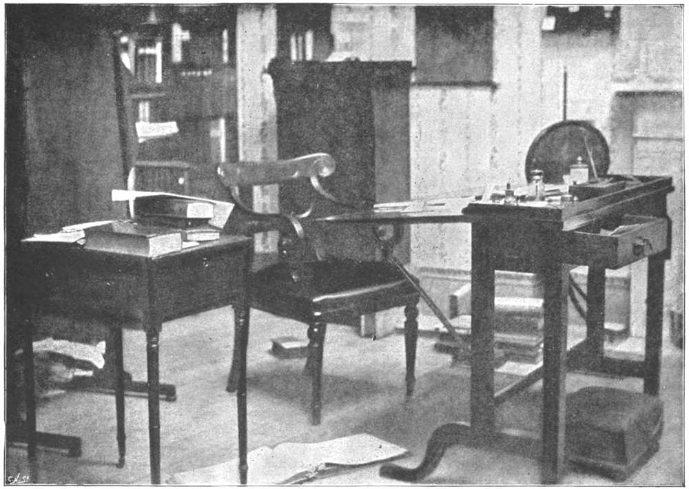 The scheme looked promising on paper, but the result was “irremediably somewhat of a failure.” Although the noises in the immediate neighbourhood were excluded, sounds in the distance, “evils that he knew not of” in the lower rooms, became painfully audible; nevertheless he occupied the room as his study until 1865, and here, “whirled aloft by angry elements,”[Pg 39] he completed what Dr. Garnett named well “His Thirteen Years’ War with Frederick.” His writing-table and arm-chair stood near the centre, and within easy reach was the little mahogany table for the books he happened to be using—or such of them as were not on the floor.